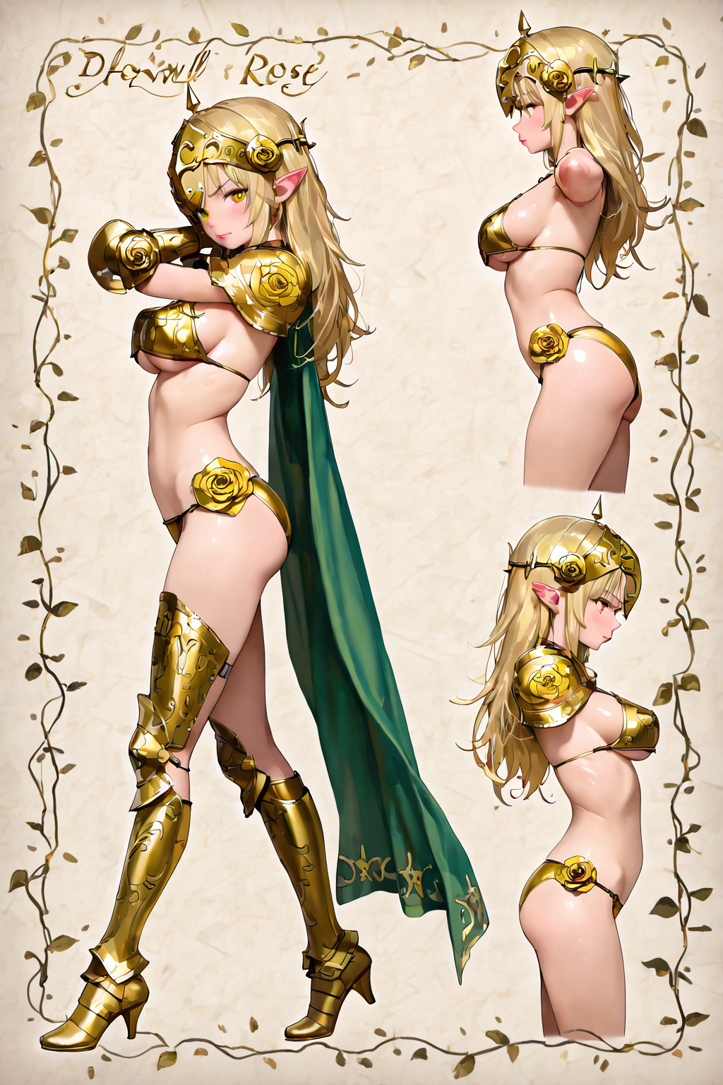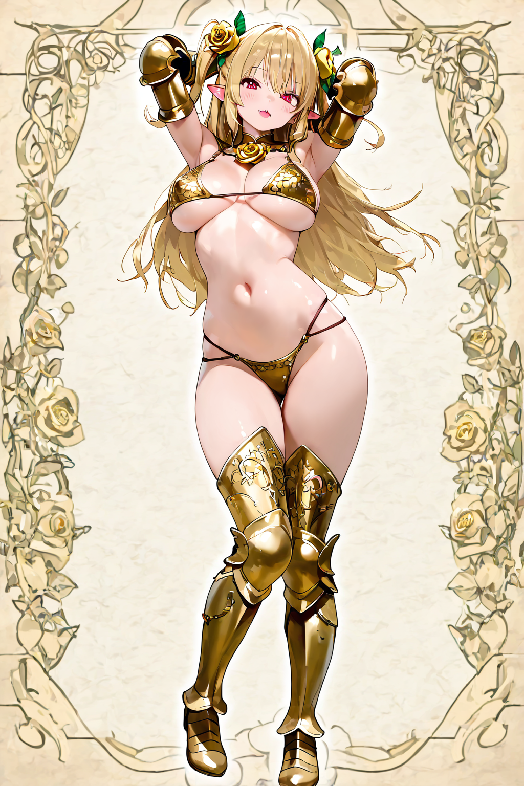 strawberry patterned golden bikini armor,