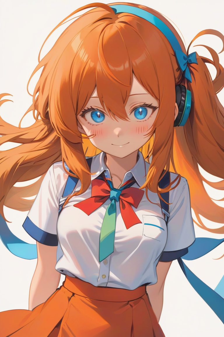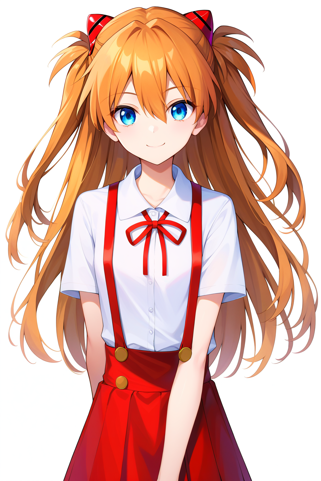 1girl,souryuu asuka langley,solo,long hair,,blue eyes,smile,white background,ribbon,shirt,simple background,orange hair,short sleeves,skirt,red ribbon,neck ribbon,white shirt,bangs,hair between eyes,looking at viewer,tokyo-3 middle ,signature,closed mouth,two side up,hair ornament,suspender skirt,interface headset,suspenders,v,cowboy shot,blue skirt, score_9,score_8_up,score_7_up,