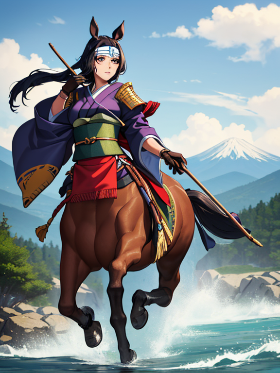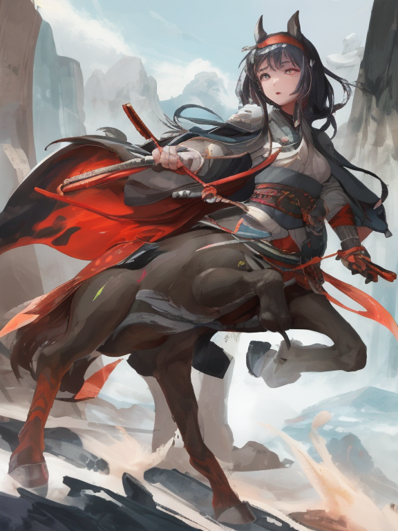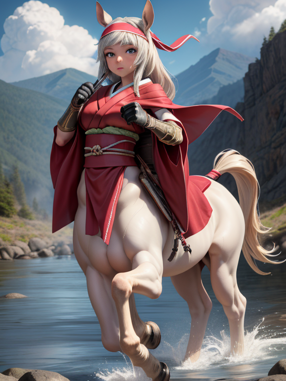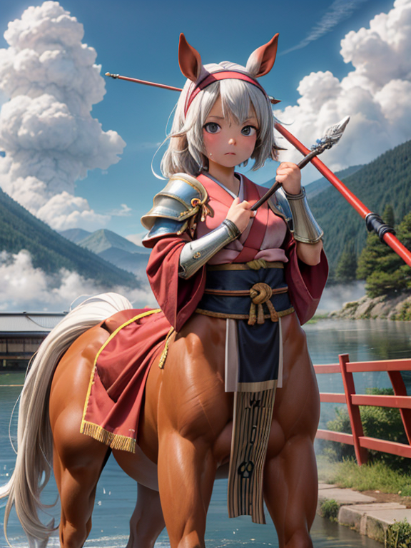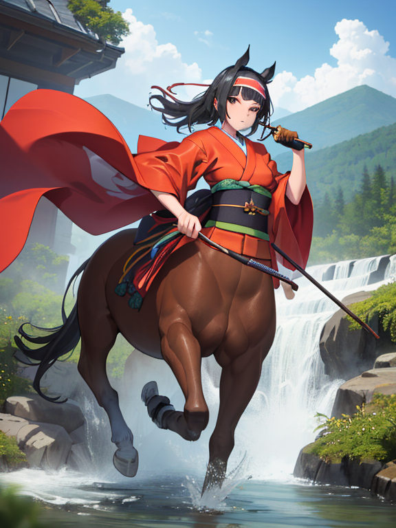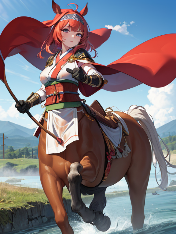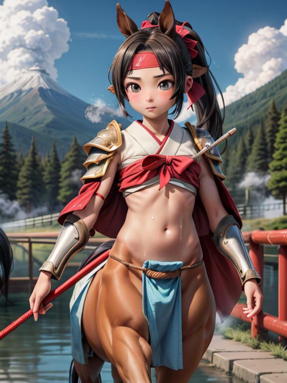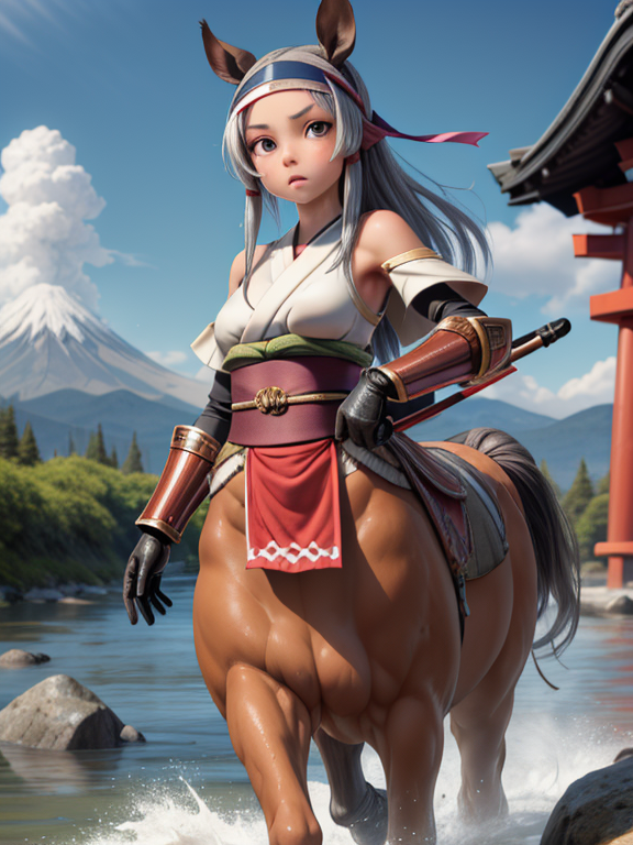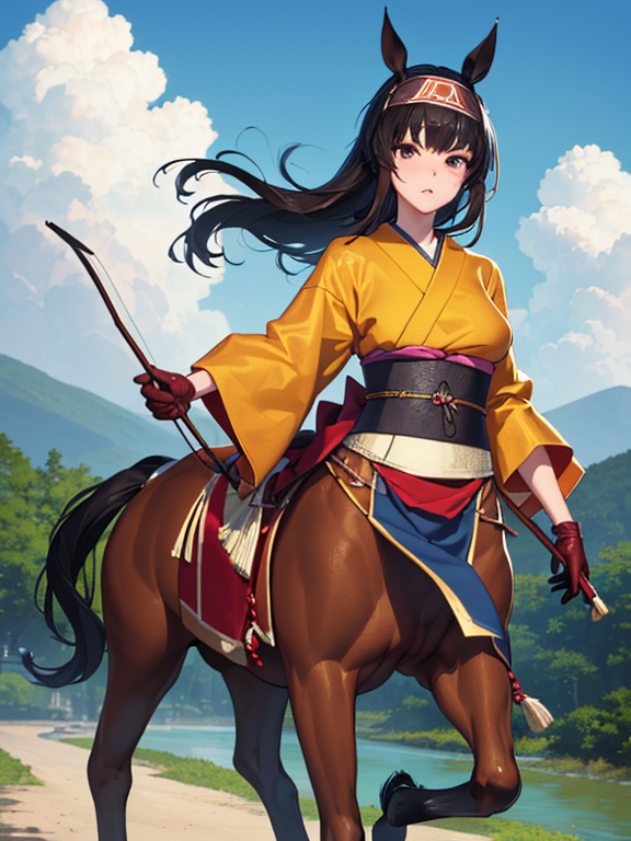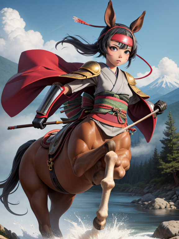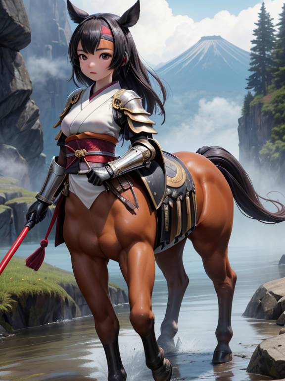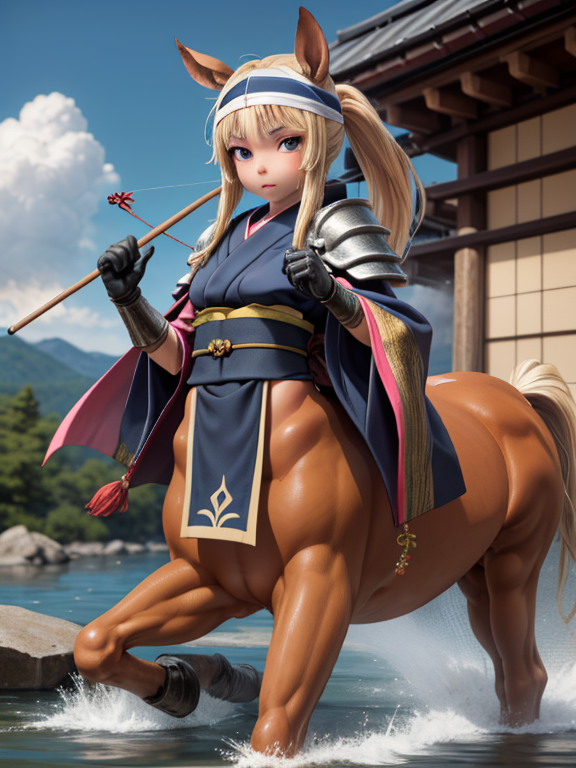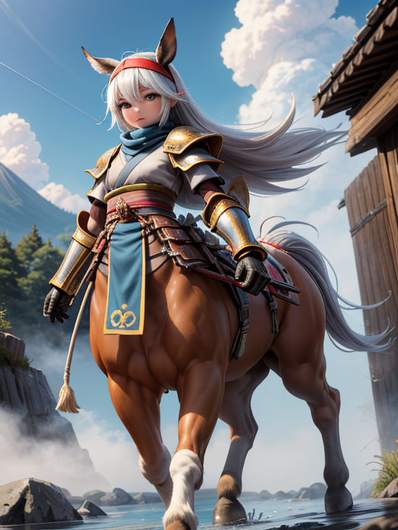 (1 japanese Warrior centaurcpt), ( horse ears ), ( 4 horse-legs ) , ( loincloth ), big gauntlets, metal gloves, metal headband, hand holding longbow, running, face viewer,