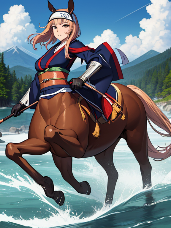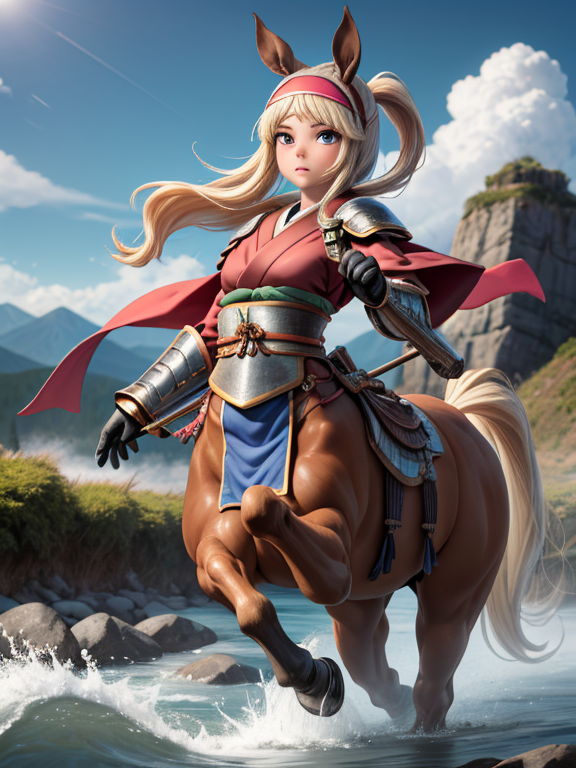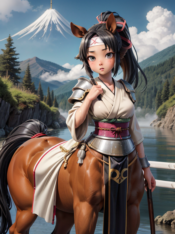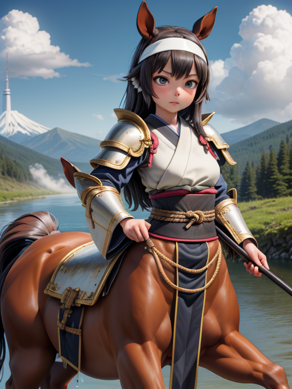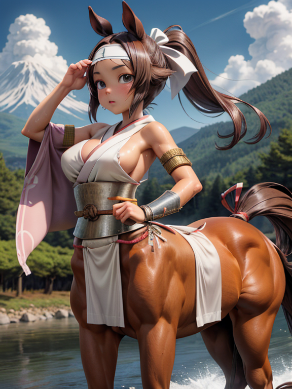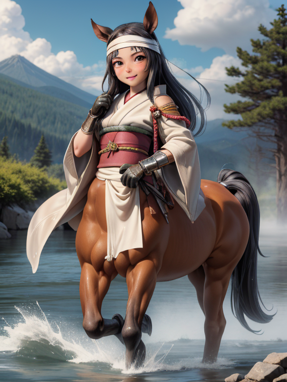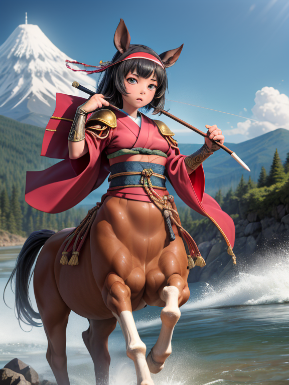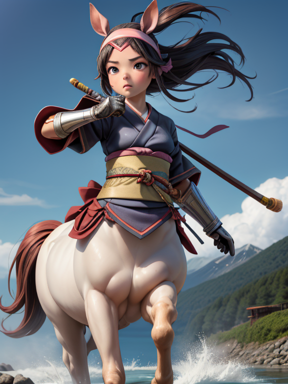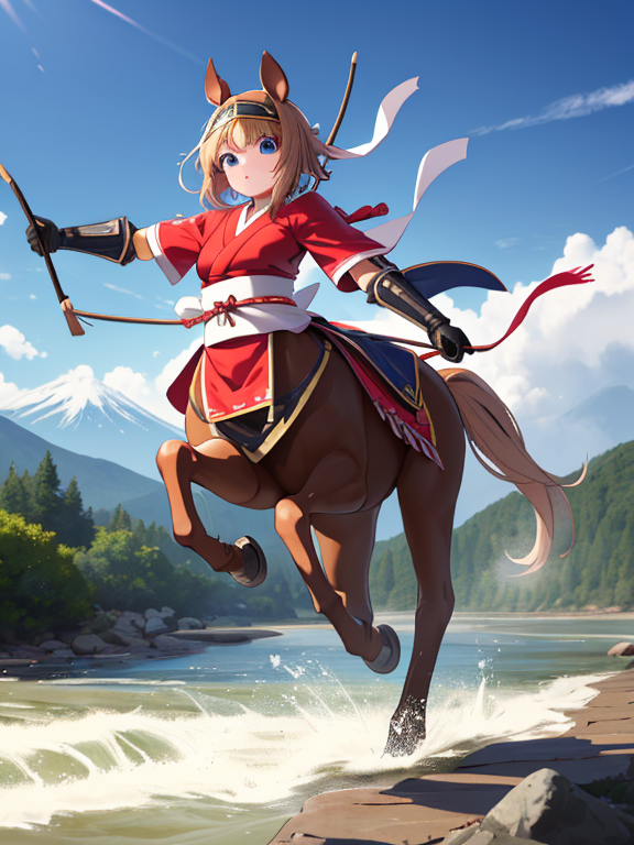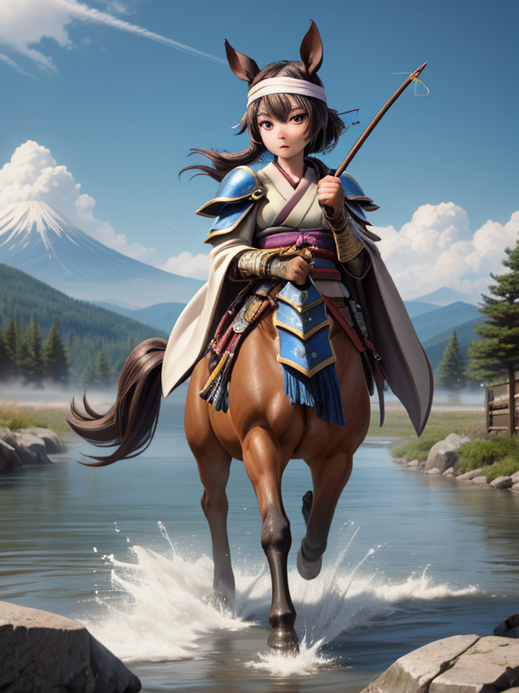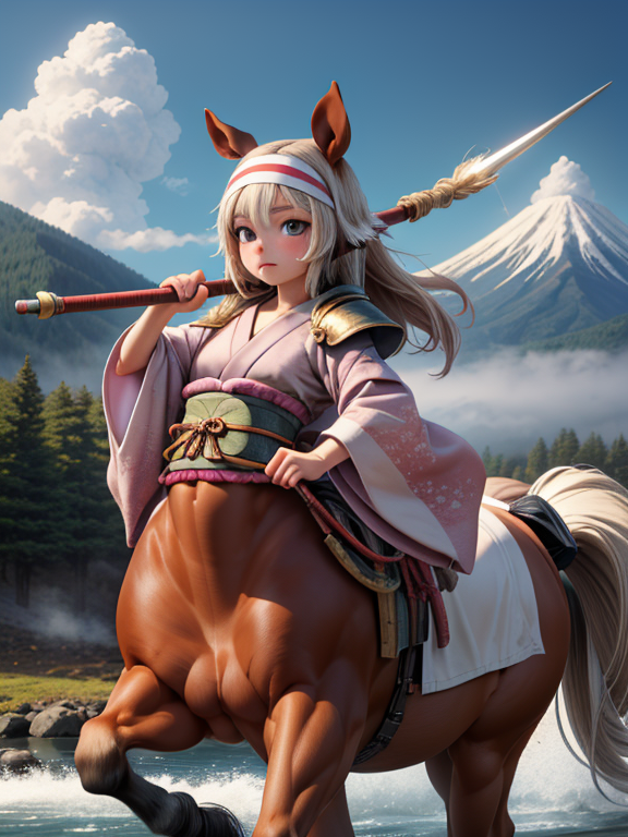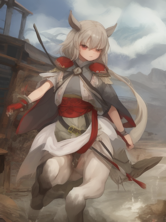 (1 japanese Warrior centaurcpt), ( horse ears ), ( 4 horse-legs ) , ( loincloth ), big gauntlets, metal gloves, metal headband, hand holding longbow, running, face viewer,