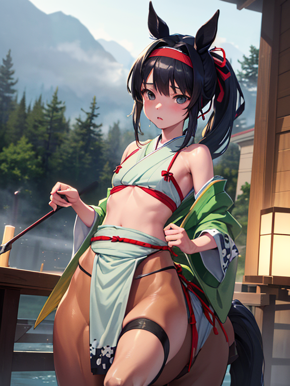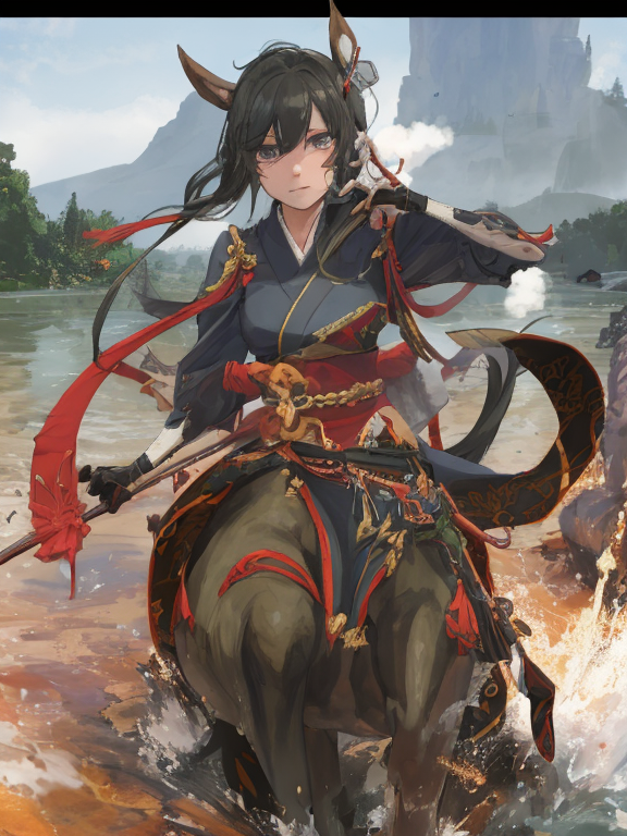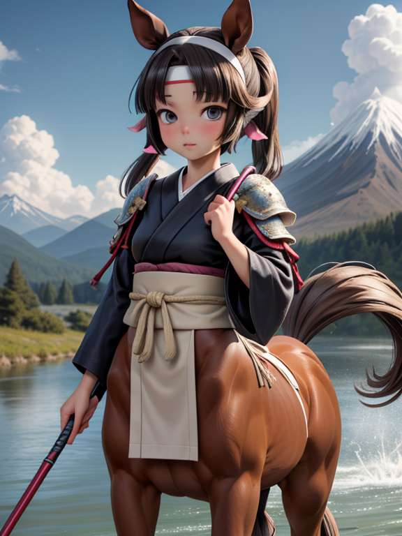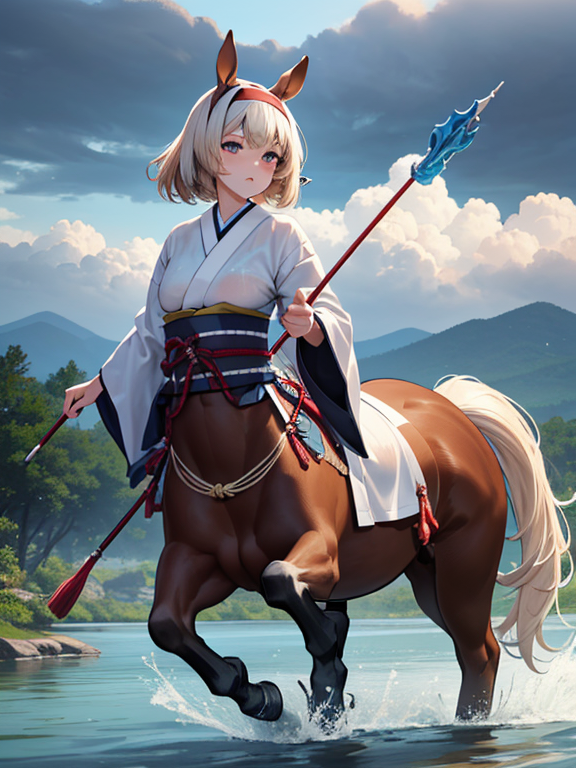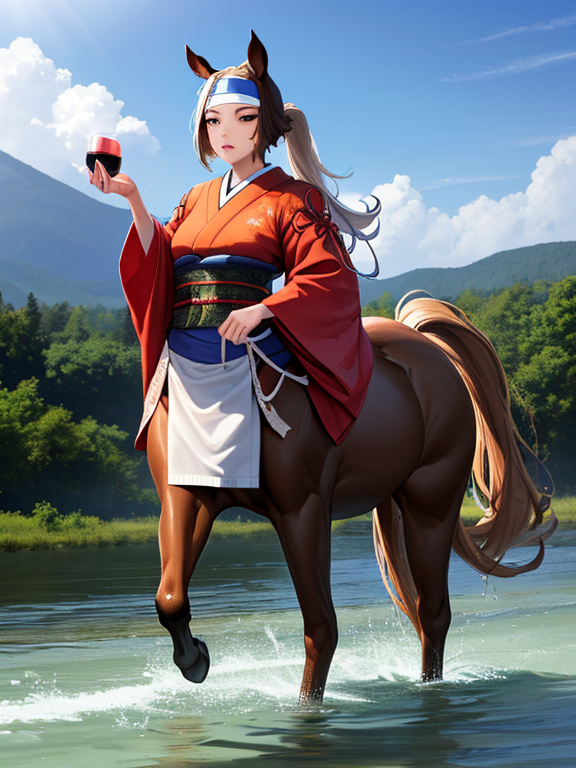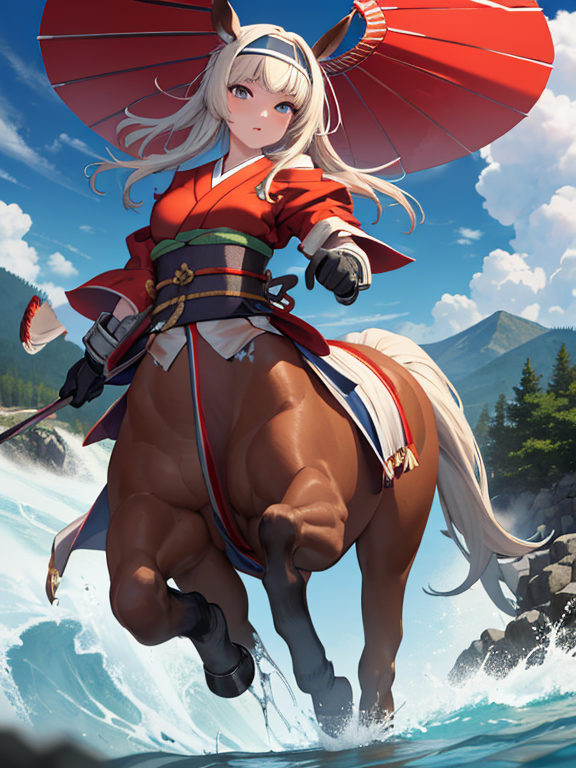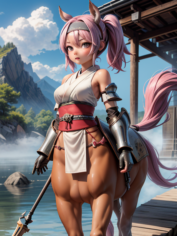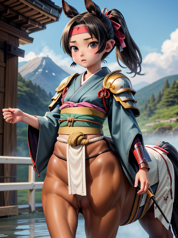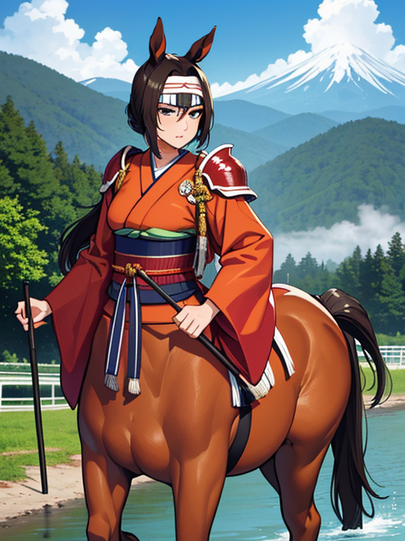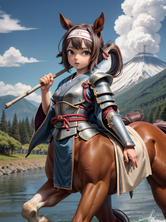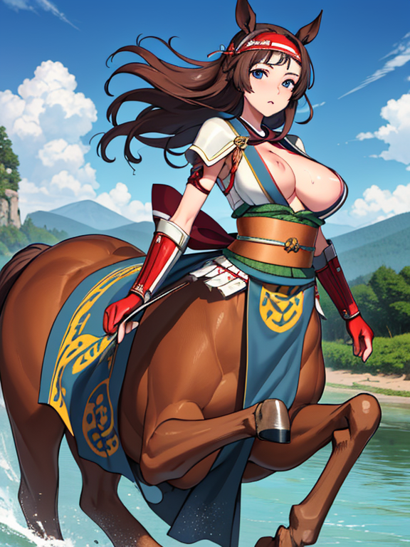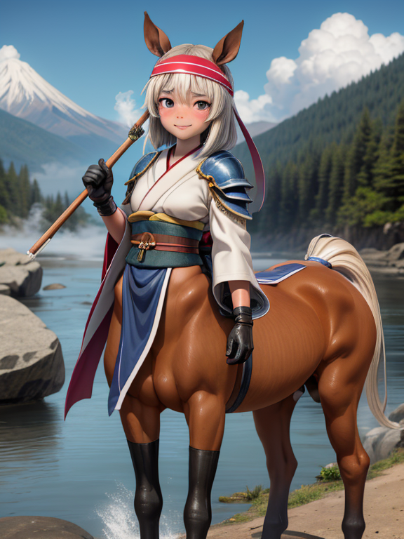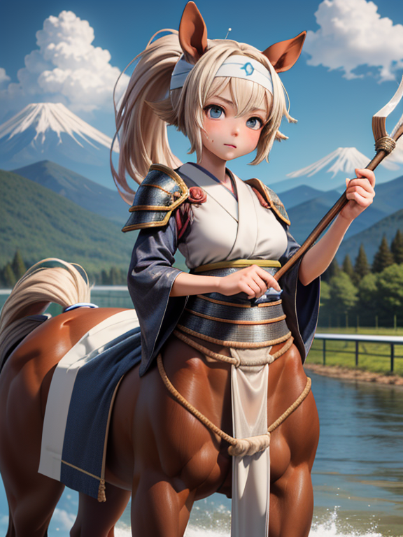 (1 japanese Warrior centaurcpt), ( horse ears ), ( 4 horse-legs ) , ( loincloth ), big gauntlets, metal gloves, metal headband, hand holding longbow, running, face viewer,