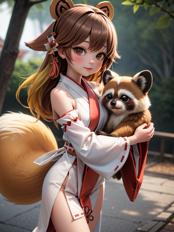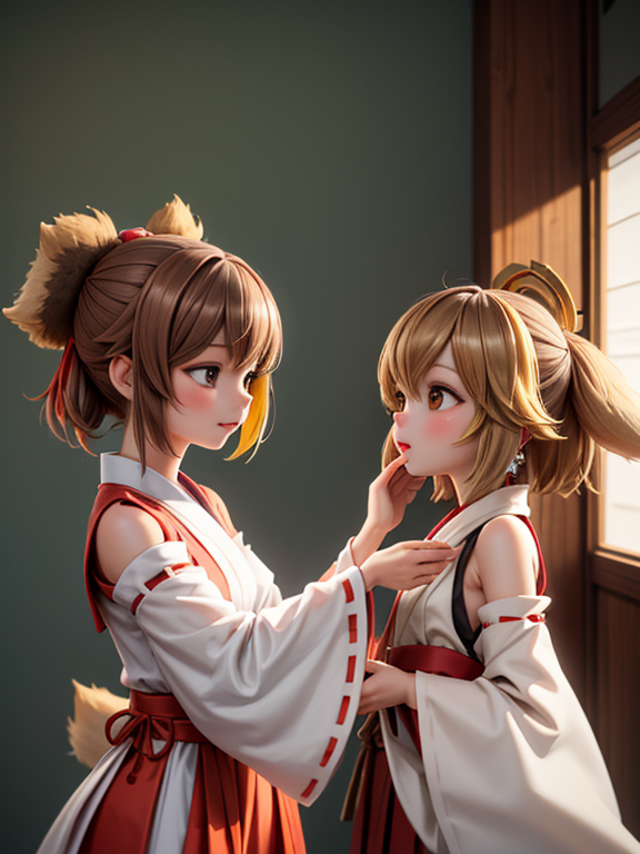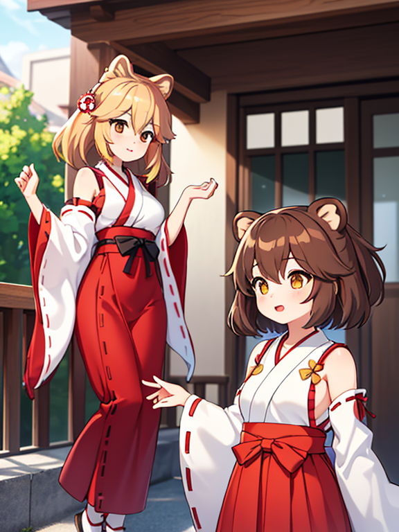 2 girls, ( glamorous tanuki miko Girl with brown hair ) , ( slender fox miko girl with yellow hair ),