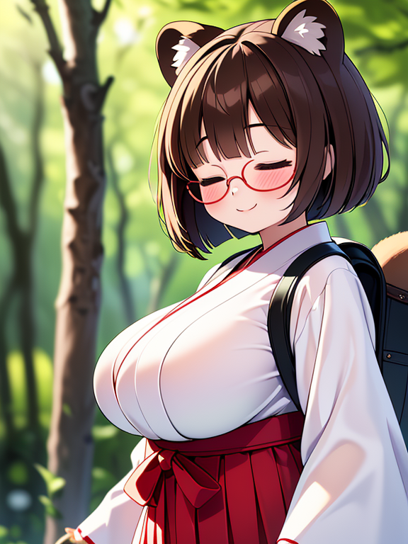 2 girls, ( glamorous tanuki miko Girl with brown hair and close eyes ) , ( slender fox miko girl with yellow hair and slant eyes ),