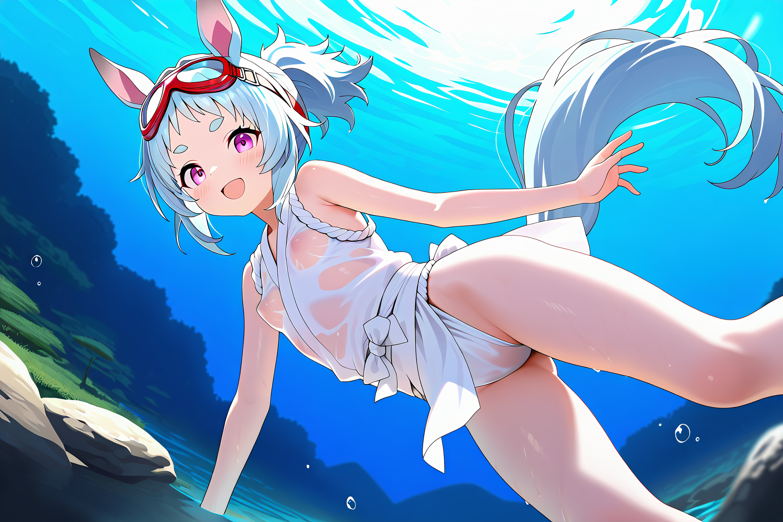 ,1 horse loli girl, horse ears , horse tail, short stature , thick eyebrows , short ponytail hair, light blue hair , ultra super fine gorgeous detailed White Japanese sleeveless cloth with white hundoshi,, wet, swimming goggles,