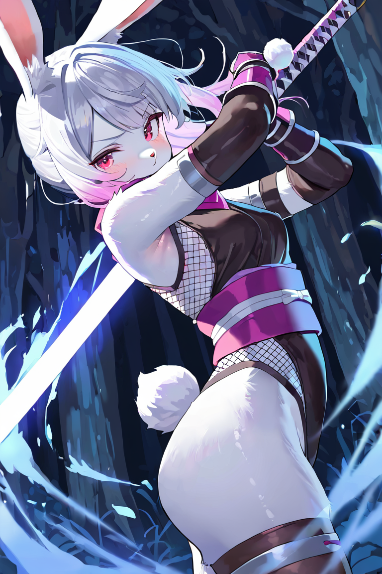 , 1 ninja ( anthromorphic rabbit:1.4 ) girl , moe detailed face, rabbit ears, rabbit tail, rabbit nose, furry skin , fluffy, ultra super fine gorgeous detailed ninja fishnet leotard with obi, , wrist cuffs, ,