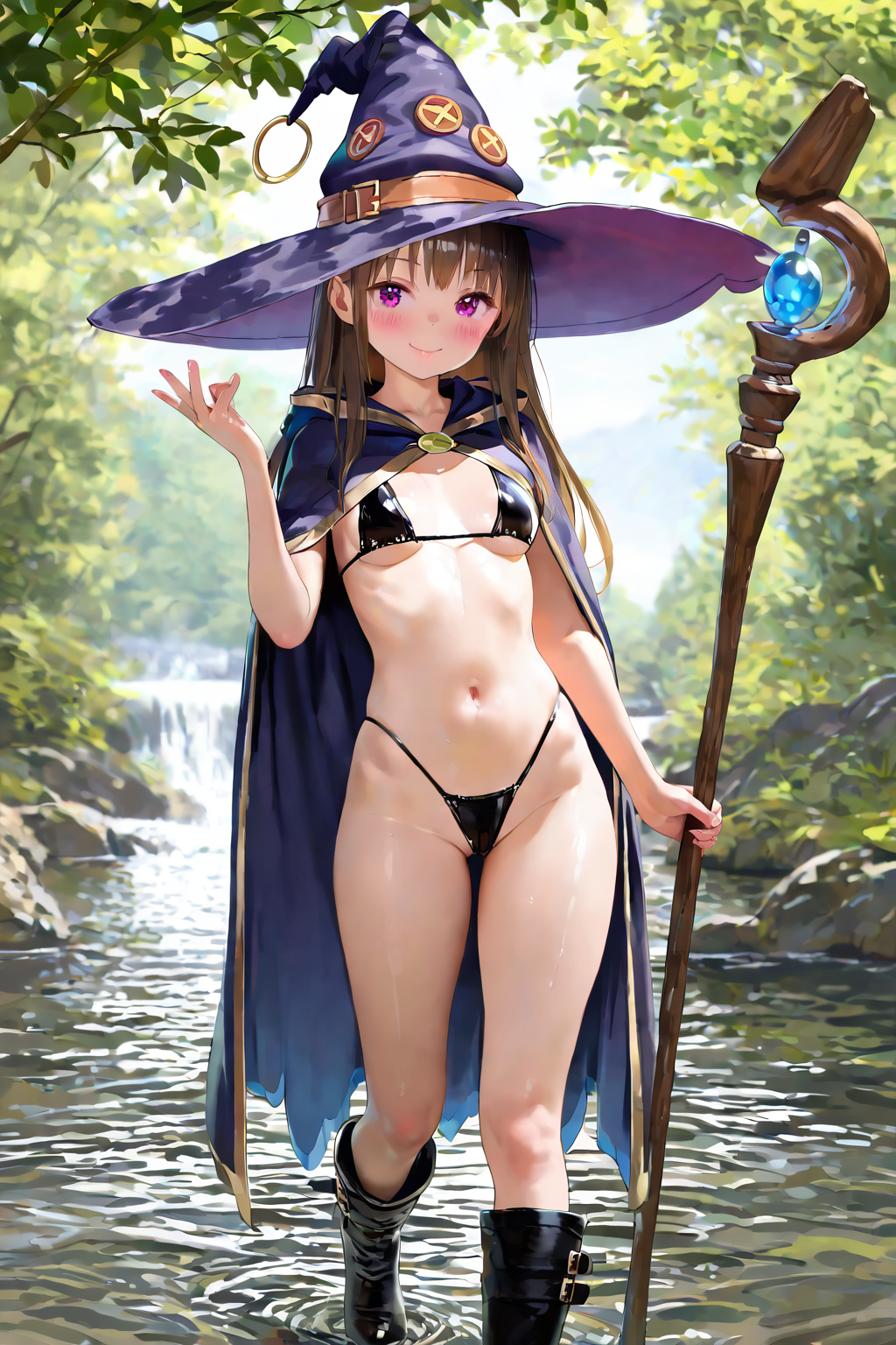 , 1 Witch loli girl, kawaii detailed face, semi‑realistic highly detailed sky blue leather Slingshots swimsuit armor with delicate beadwork and jewely decoration , boots, , small breasts girl, cute hip , , hold magic scepter, wizard cloak , ,