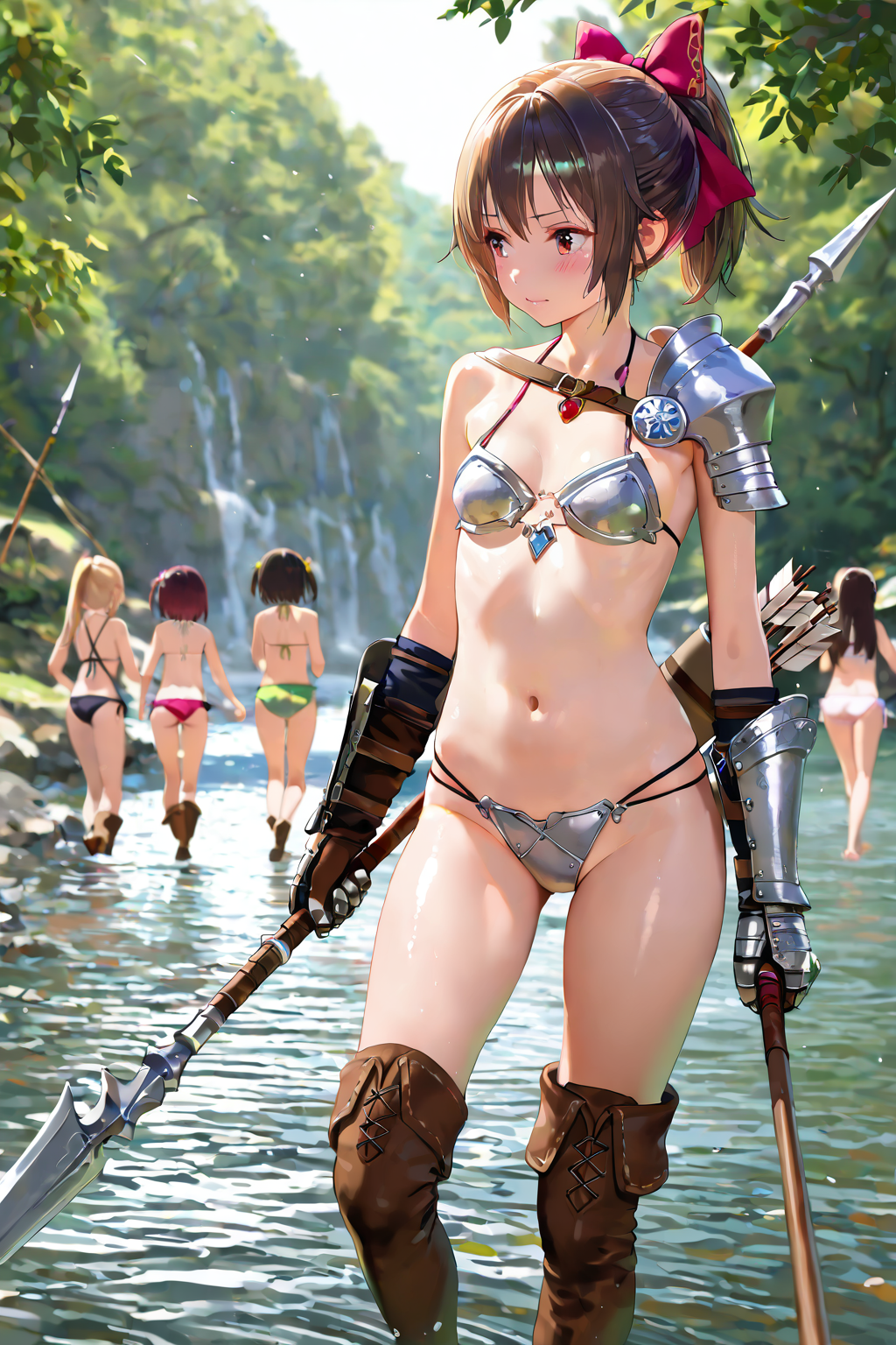 , 4 loli girls, kawaii detailed face, semi‑realistic highly detailed multi-strapped bikini armor with delicate beadwork and jewely decoration , long boots, gauntlet , shoulder armor, small breasts girl, cute hip , hold long spear, hold the Slingshots , hold small bow and quiver,