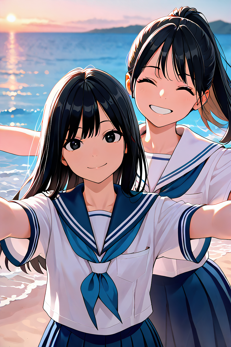 masterpiece, cute style, aesthetic style, 2girls, beach, black eyes, black hair, neckerchief, blue sailor collar, blue skirt, closed eyes, long hair, looking at viewer, ocean, outdoors, outstretched arms, ponytail, school uniform, serafuku, short sleeves, sky, smile, white sailor collar, white shirt