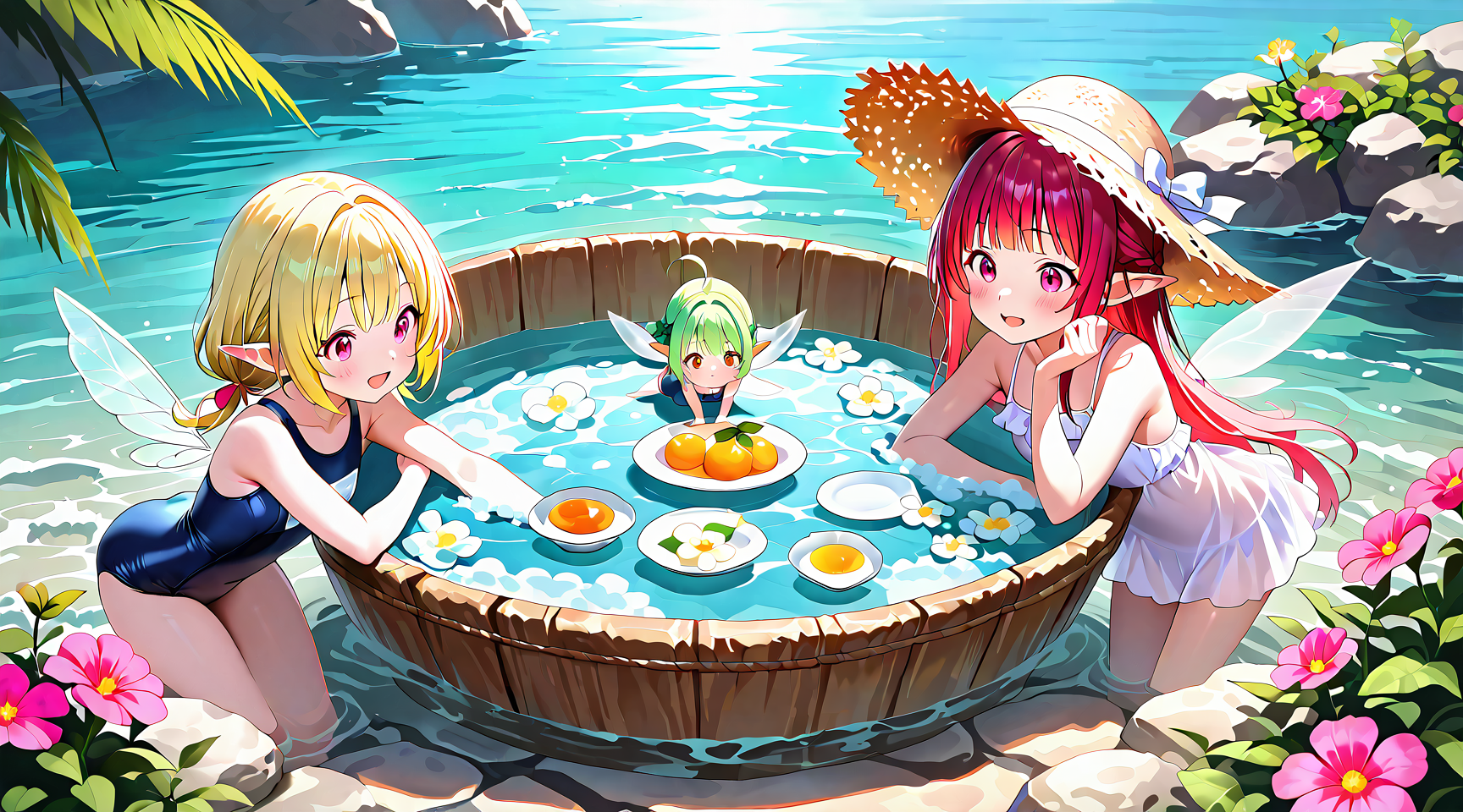 , 1 tiny fairy loli girl, moe detailed face, ultra super fine gorgeous detailed school swimsuit, Transparent fairy wings , elf ears , straw hat , ;p , sitting on giant soft serve ice cream, cream on face and body, outdoor, ,