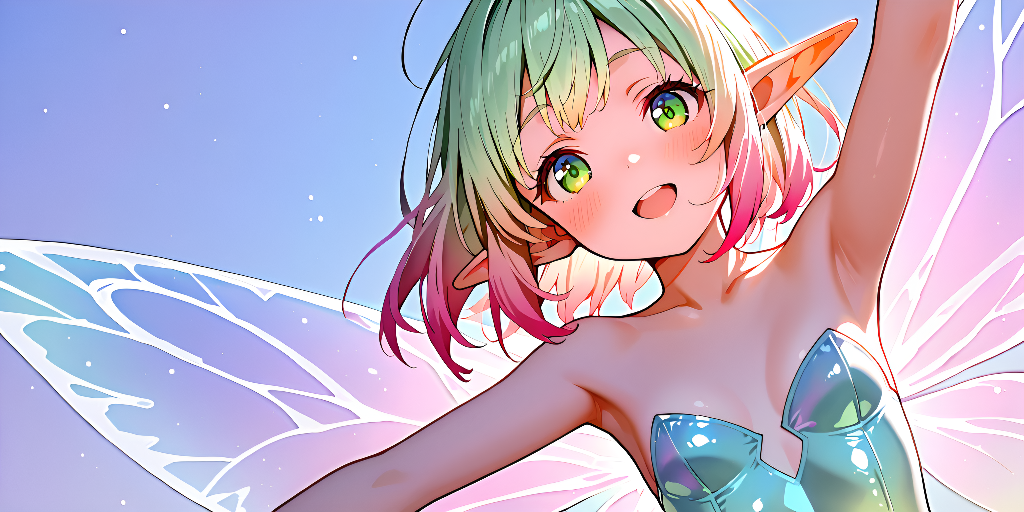 , 1 ballerina little fairy girl, moe detailed face, glossy leotard , Transparent fairy wings , elf ears , hold umbrella,