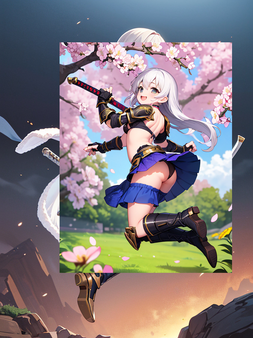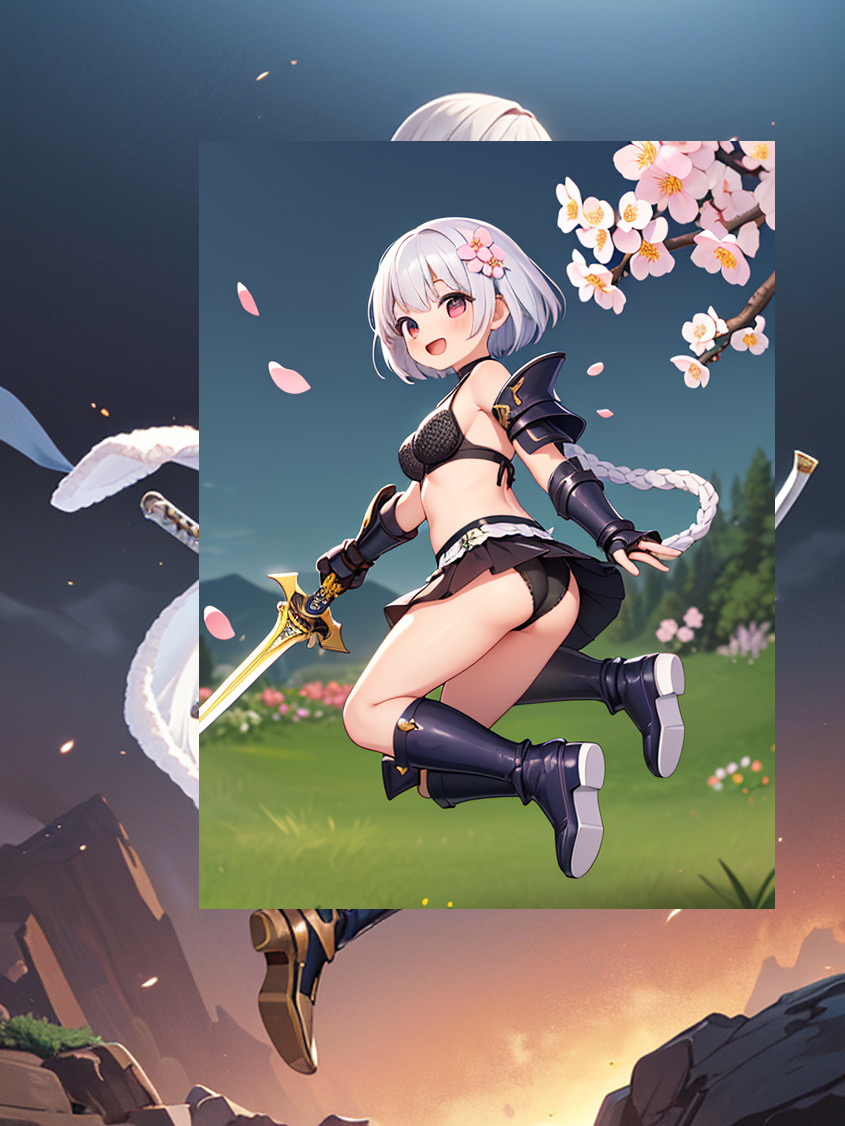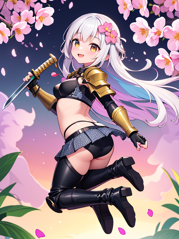 big metal gauntlets, long metal boots, long skirt, metal shoulder pad, holding a sword, from side, back, face away, jumping, face happy, long skirt, 1girl,