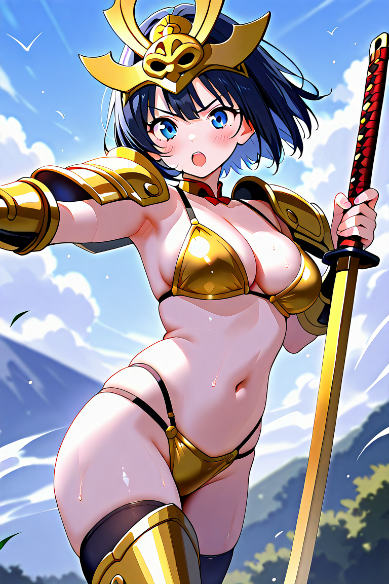 , 1 samurai child girl, ultra super fine detailed gorgeous golden samurai bikini armor , golden katana , golden Kabuto, outdoor ,