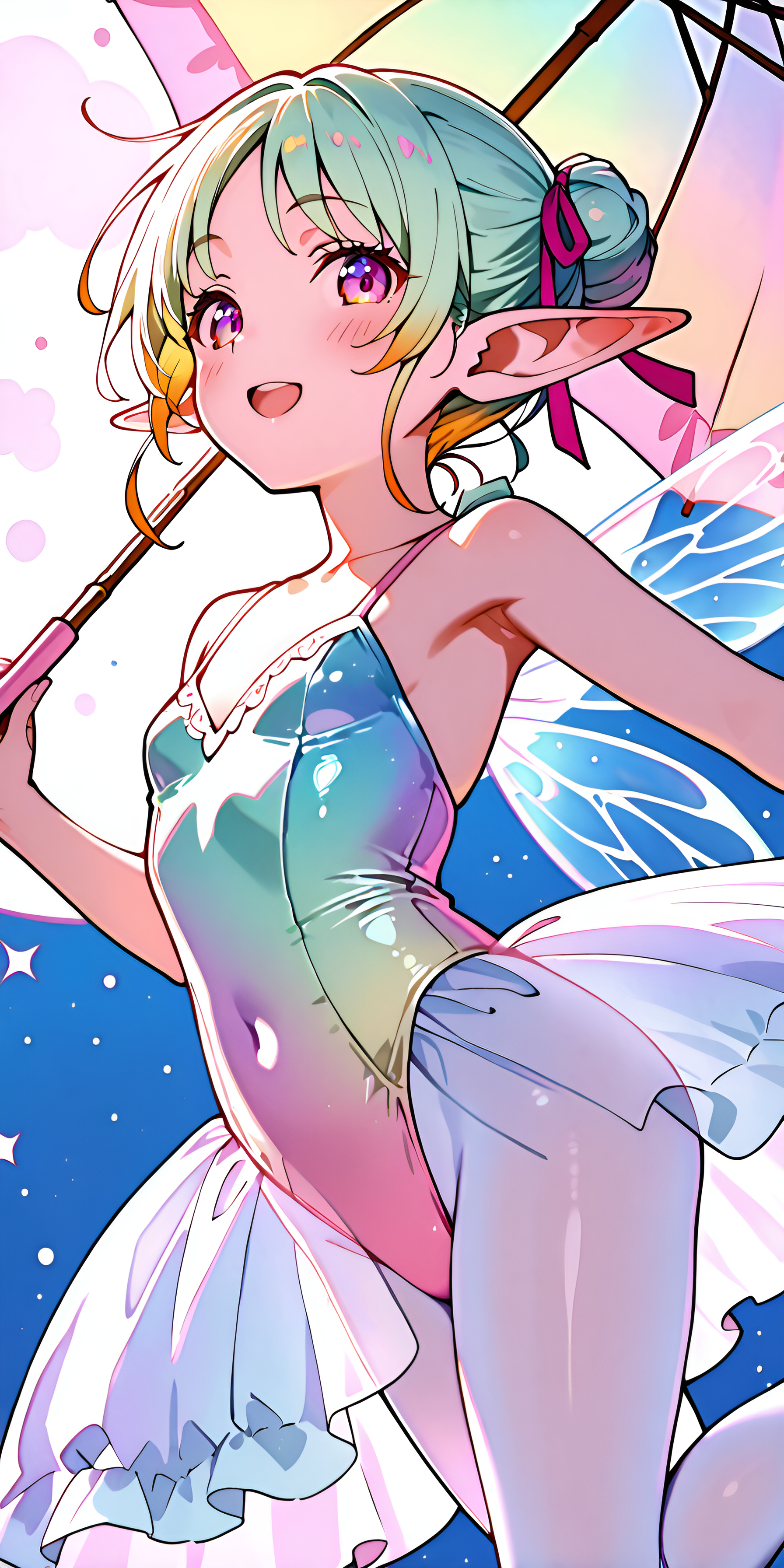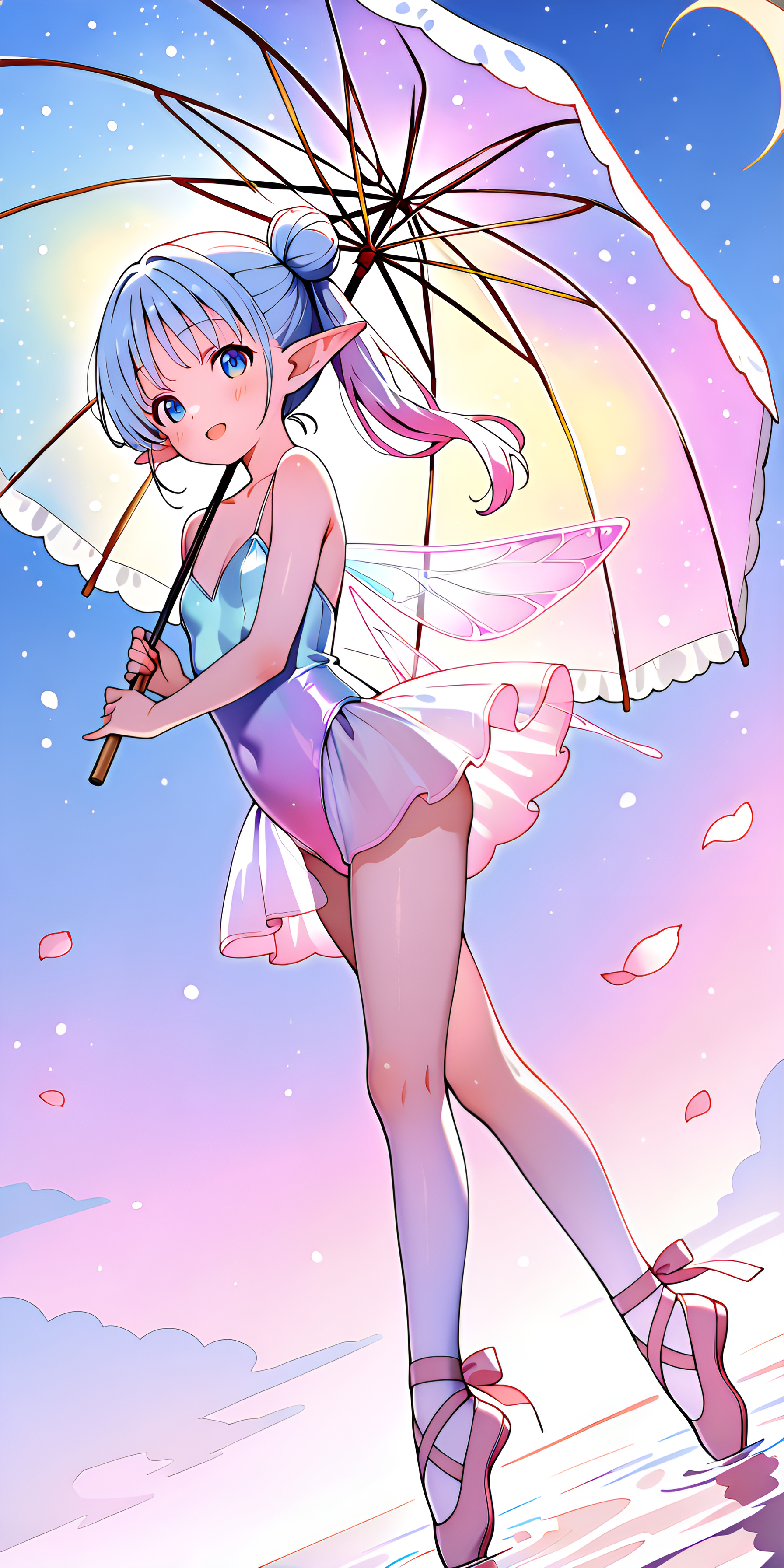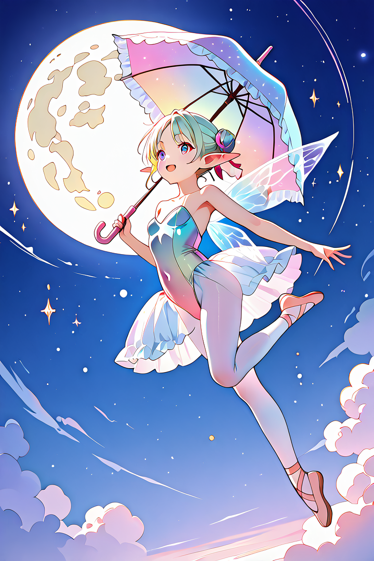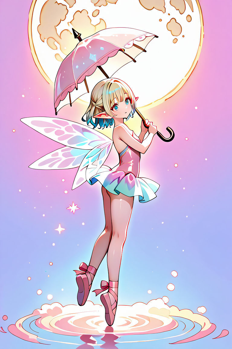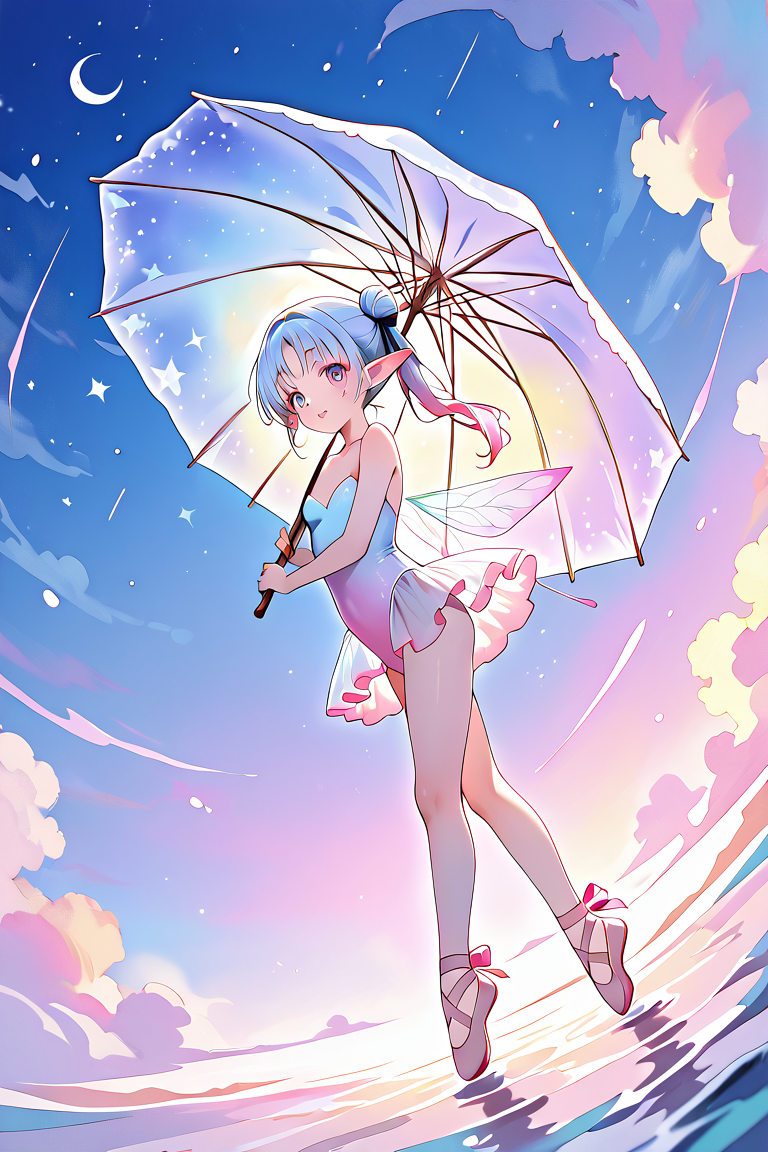 , 1 ballerina little fairy girl, moe detailed face, glossy leotard , Transparent fairy wings , elf ears , hold umbrella,