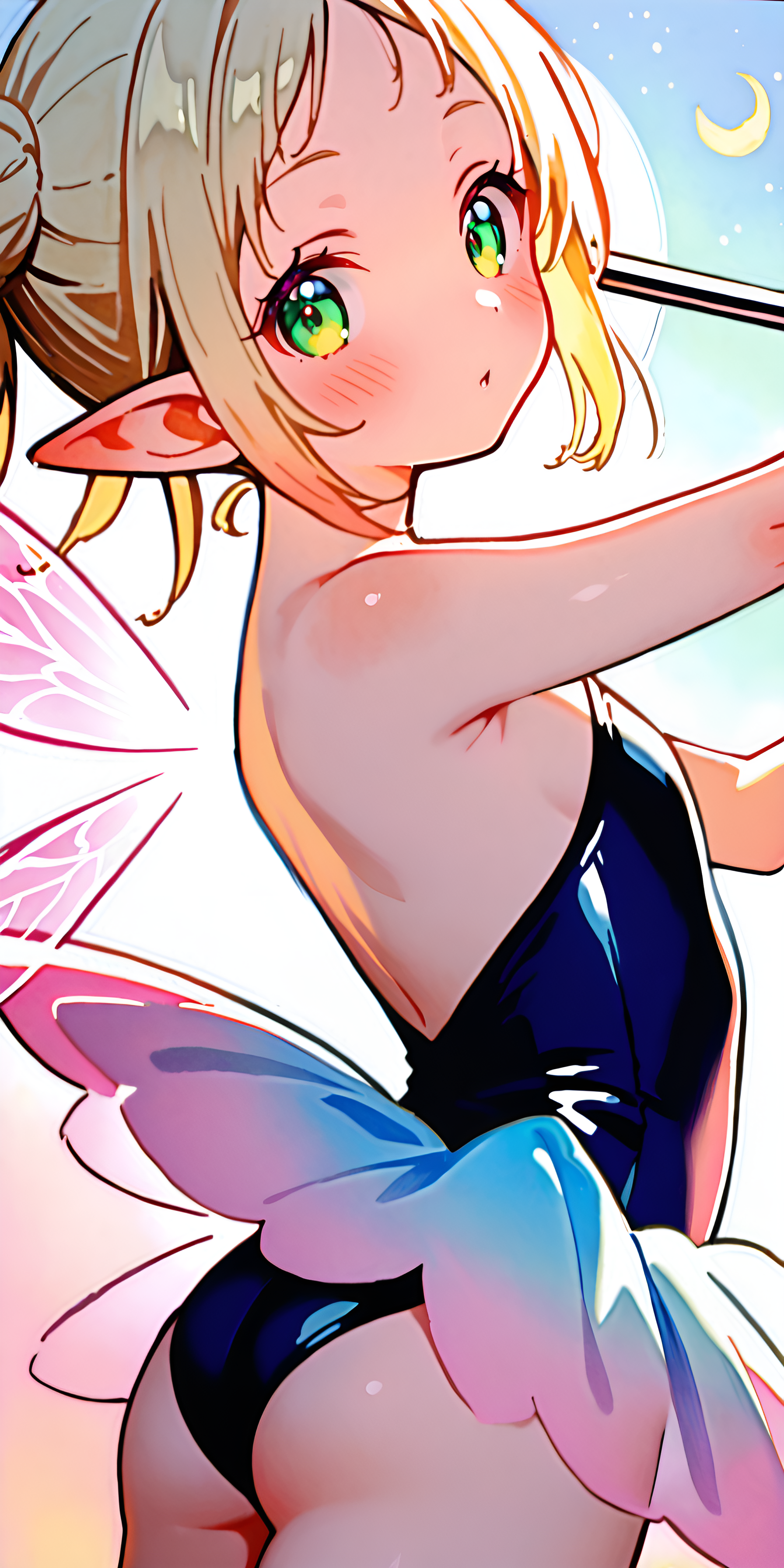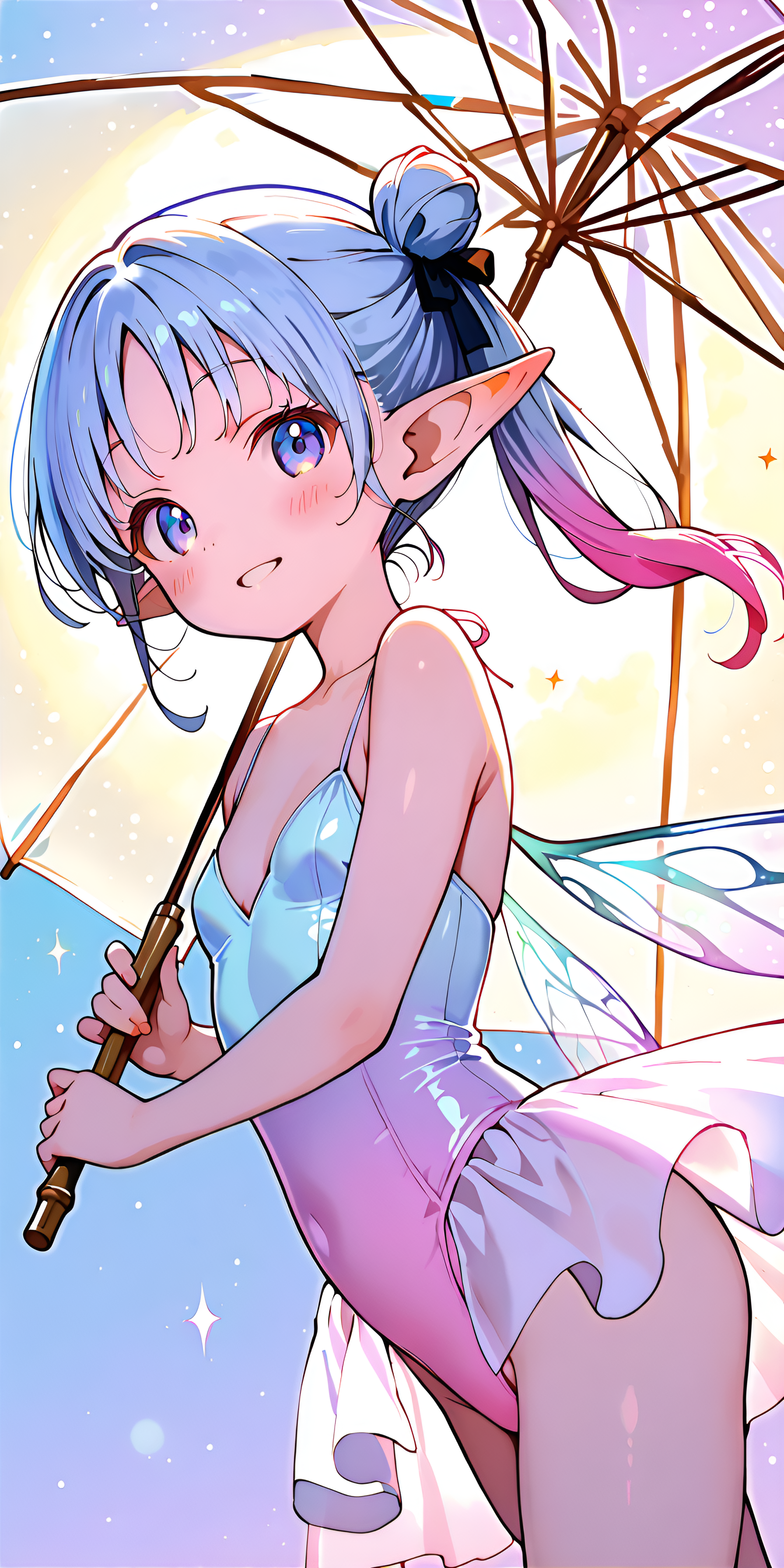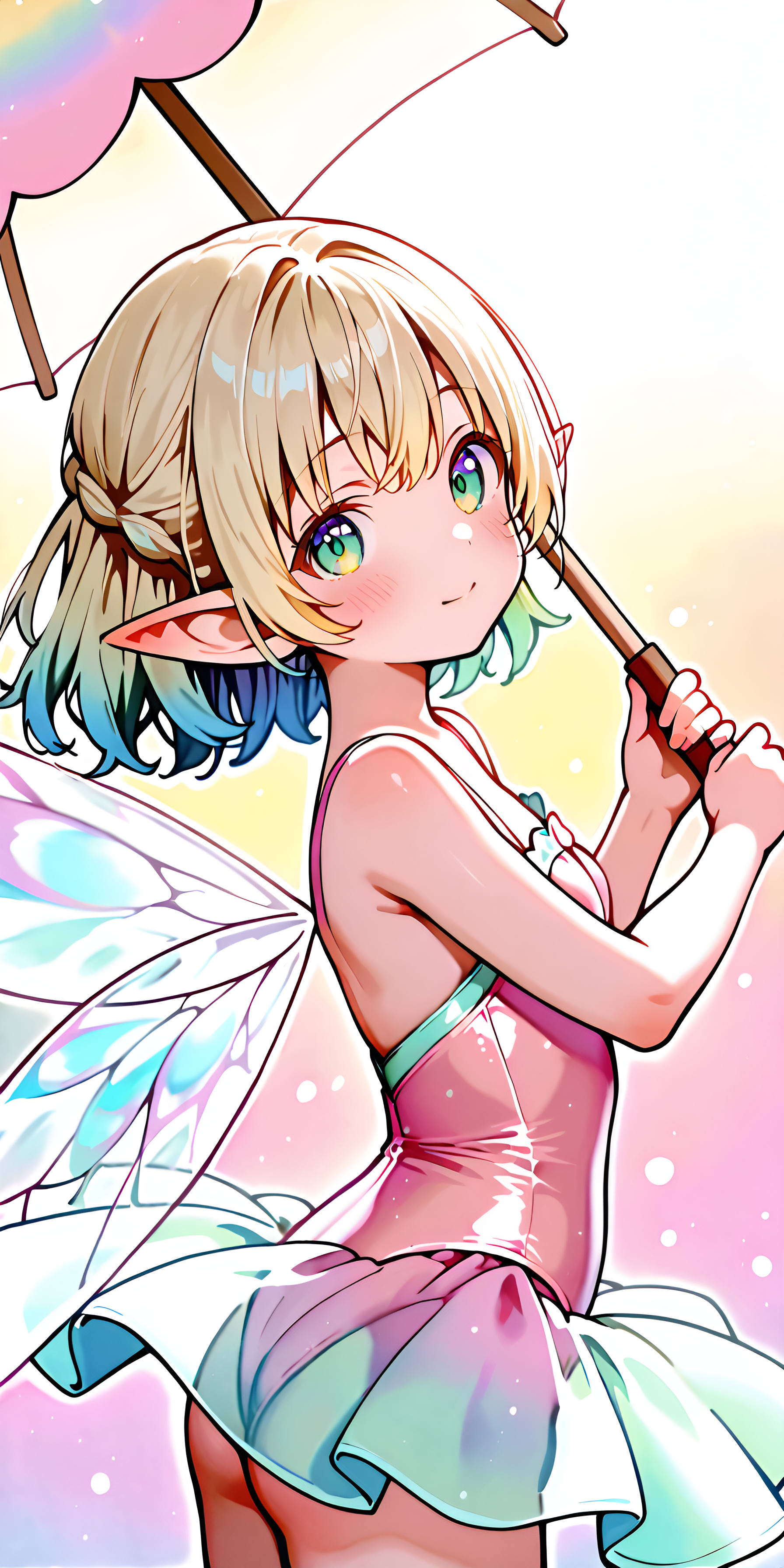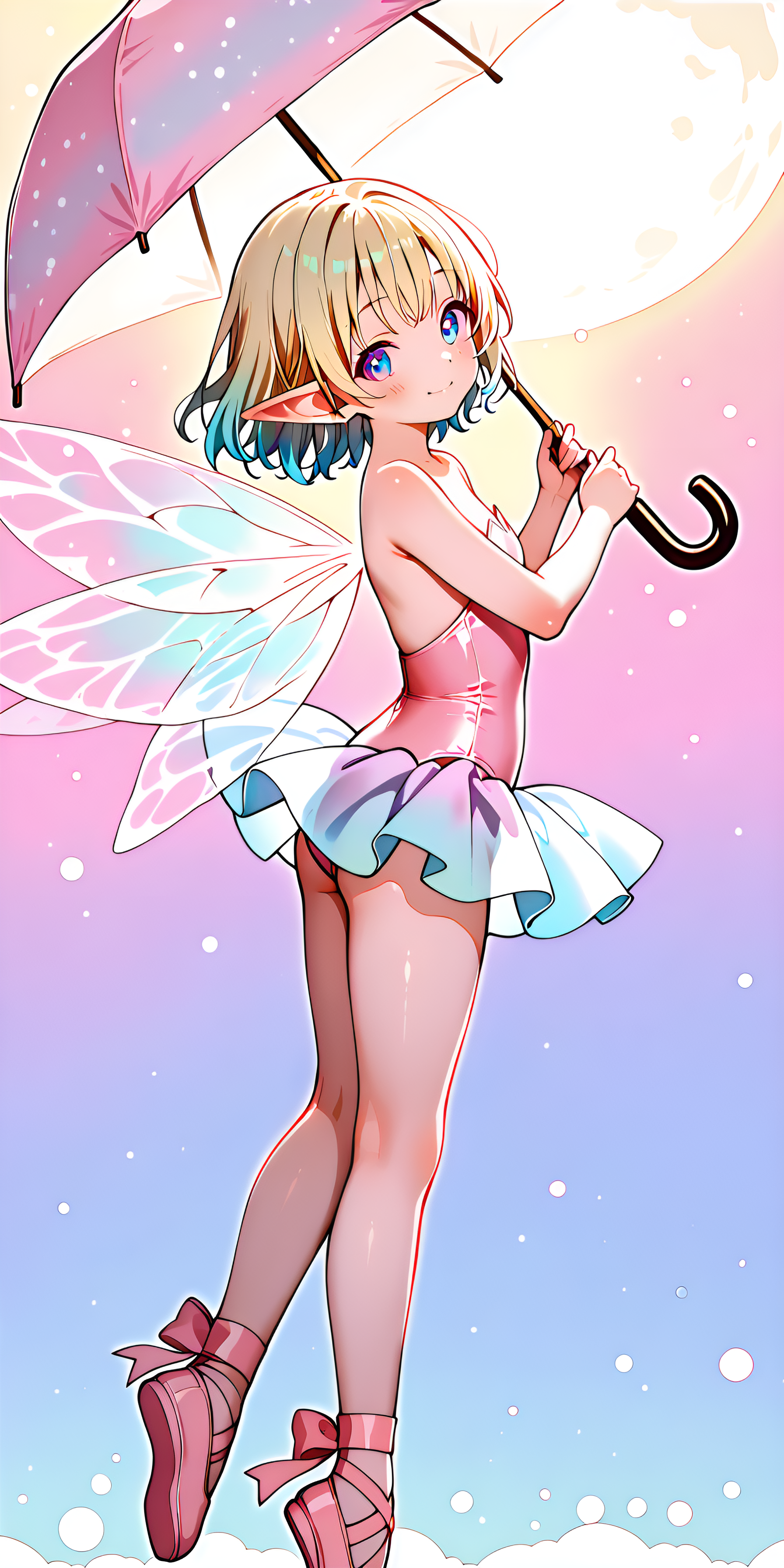 , 1 ballerina little fairy girl, moe detailed face, glossy leotard , Transparent fairy wings , elf ears , hold umbrella,