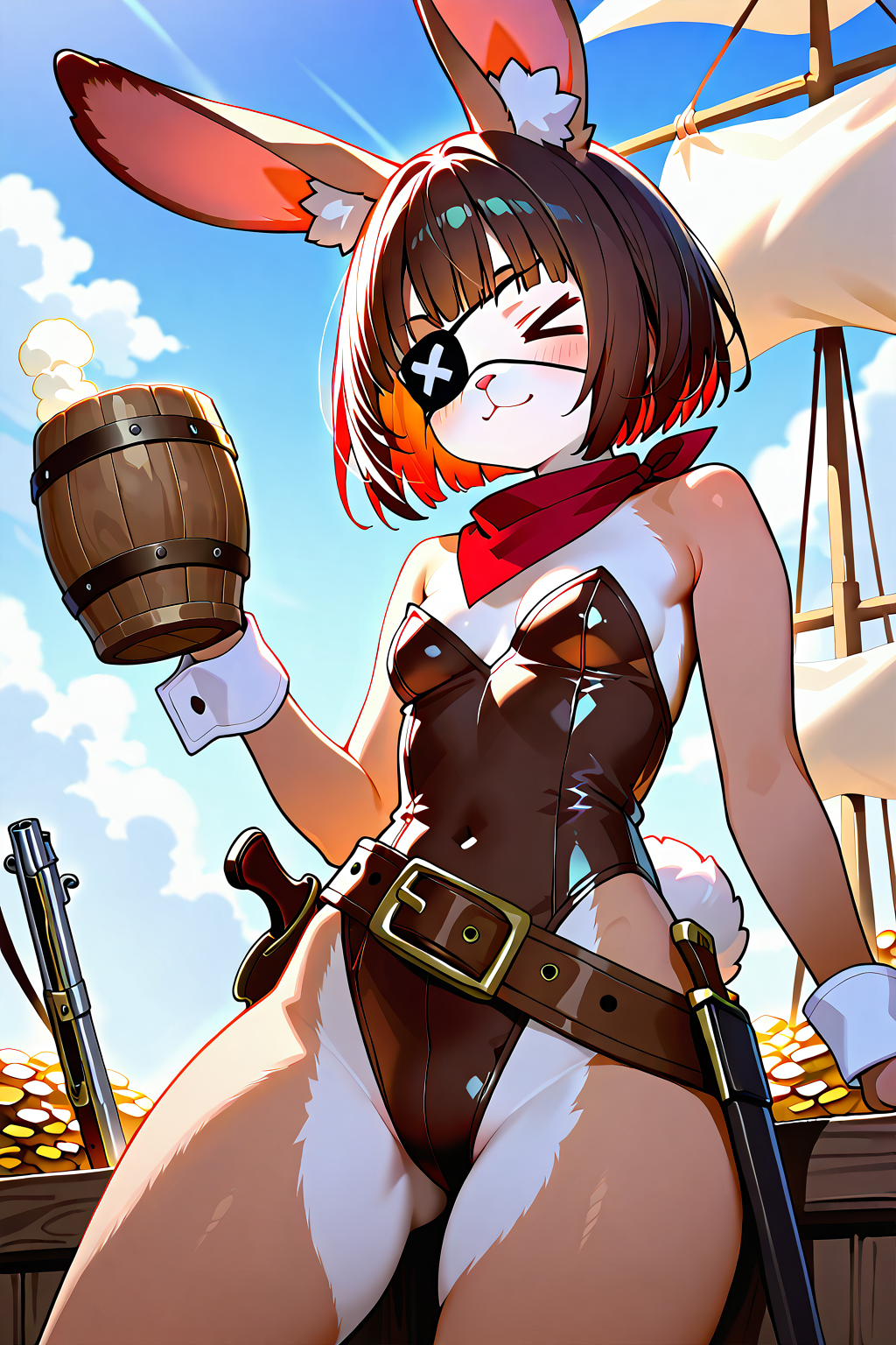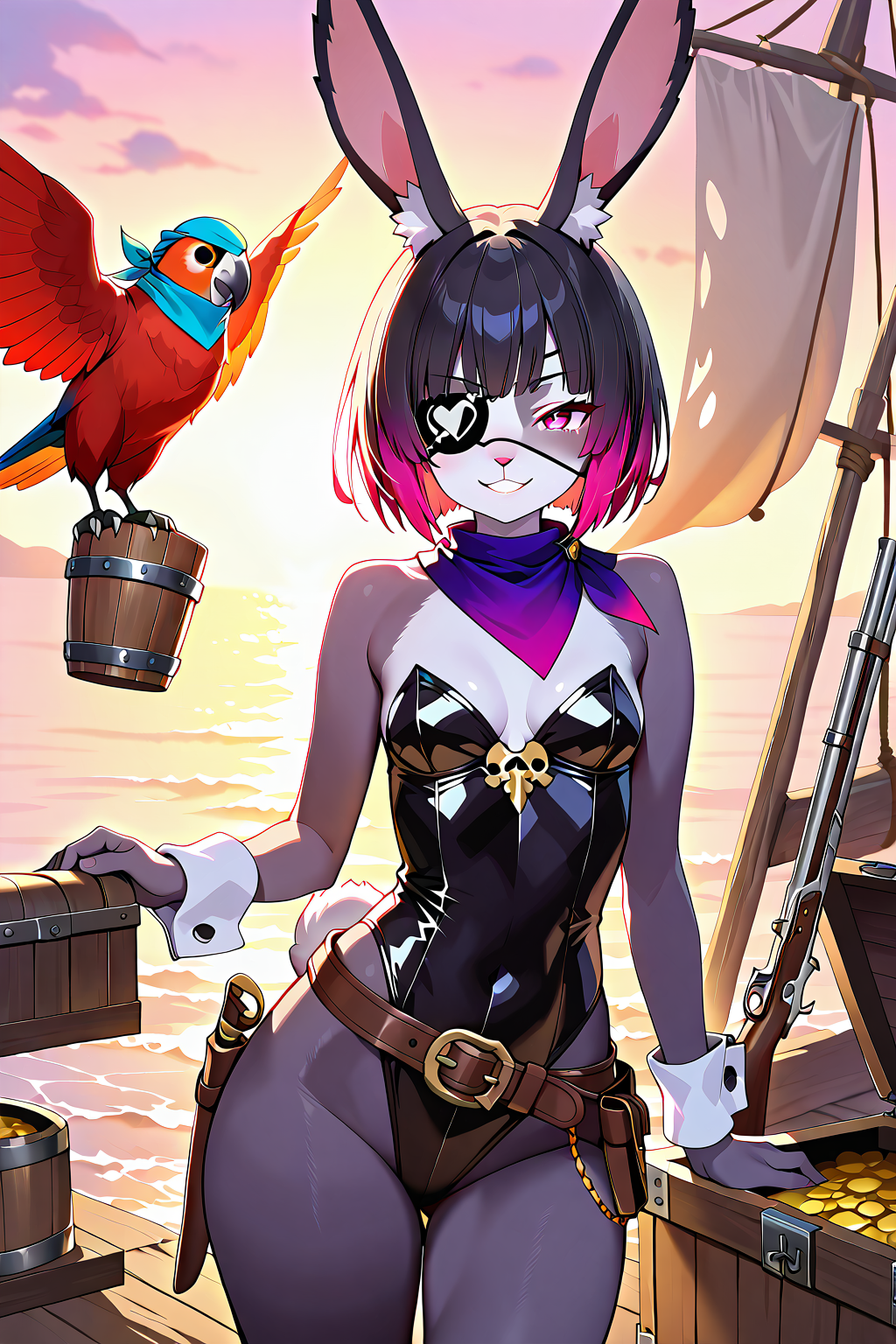 , 1 pirate ( anthromorphic rabbit ) girl , moe detailed face, rabbit ears, rabbit tail, rabbit nose, furry skin, , ultra super fine gorgeous detailed pirate stripe leotard, , wrist cuffs, ,