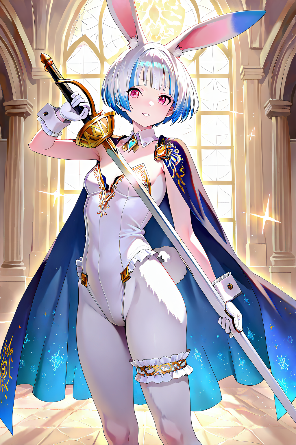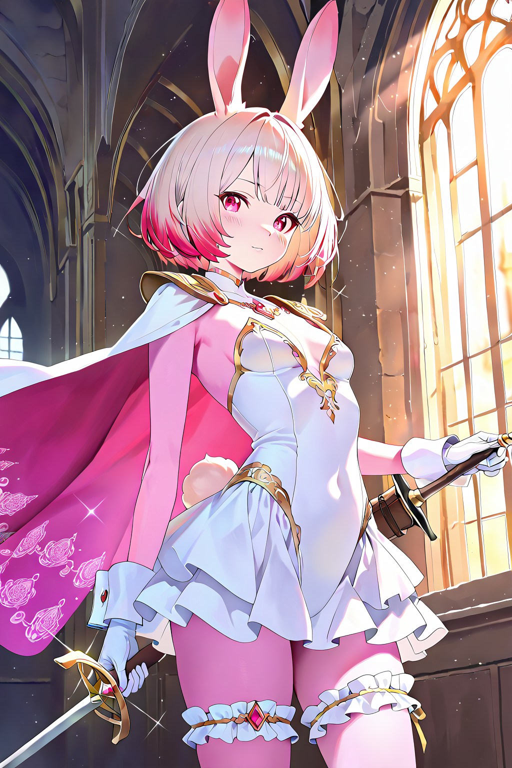 , 1 knight ( anthromorphic rabbit ) girl , moe detailed face, rabbit ears, rabbit tail, rabbit nose, furry skin, , ultra super fine gorgeous detailed bridal garter with cape, , wrist cuffs, ,