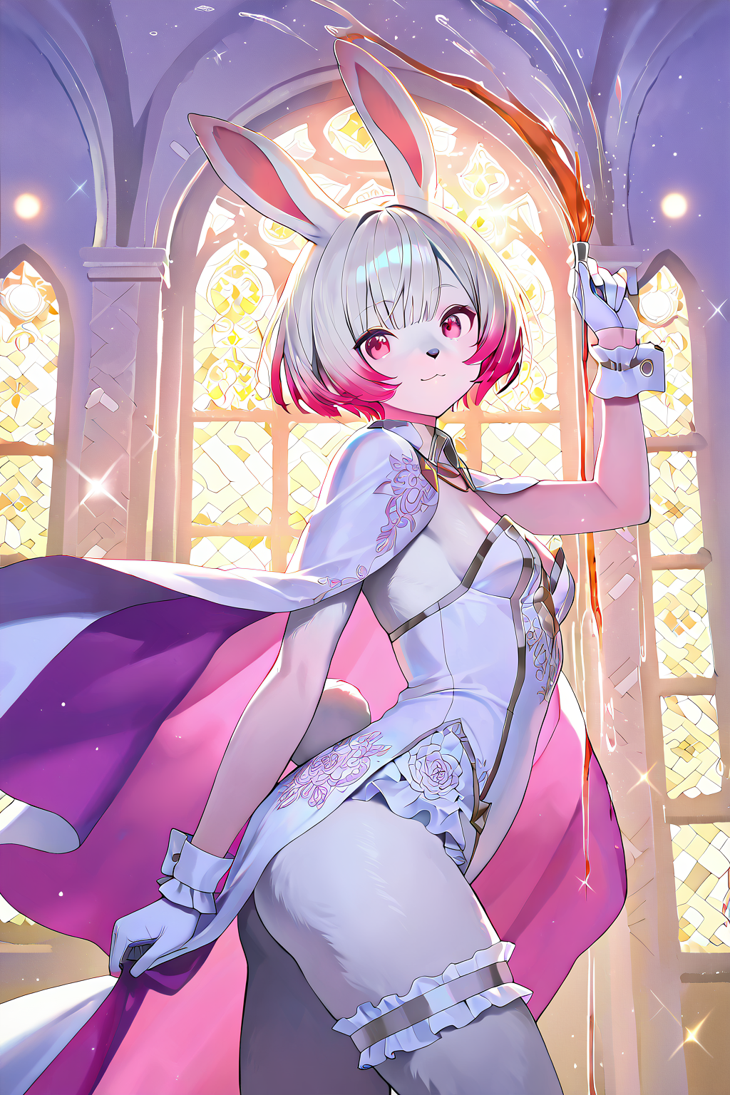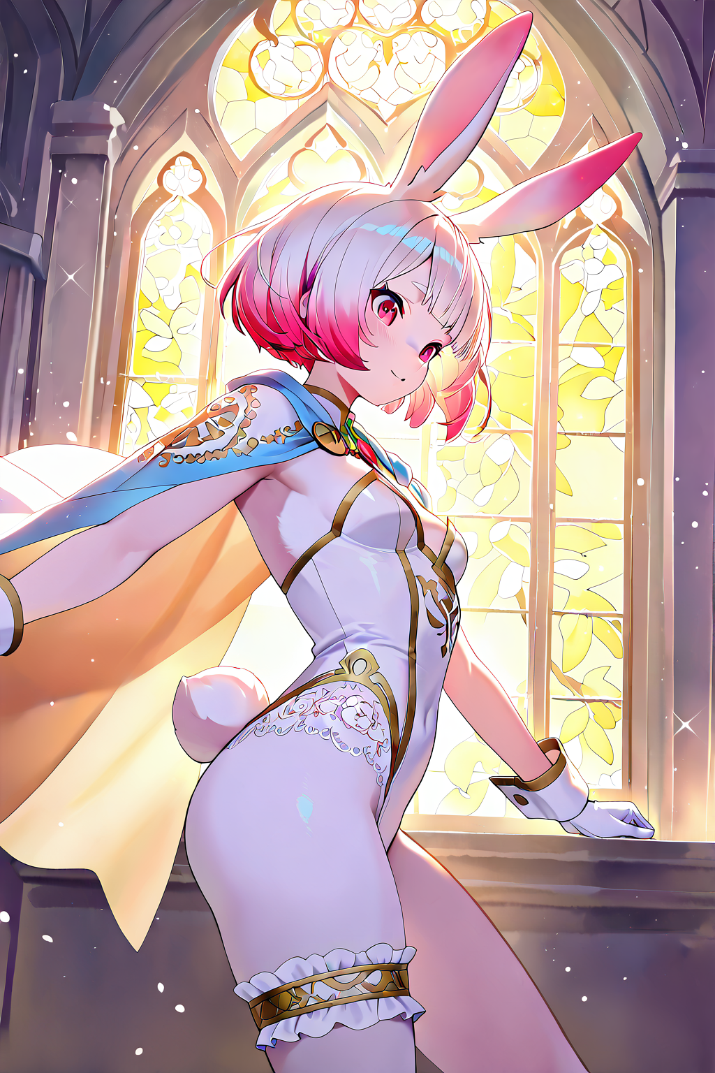 , 1 noble ( anthromorphic rabbit:1.4 ) girl , moe detailed face, rabbit ears, rabbit tail, rabbit nose, furry skin , fluffy, ultra super fine gorgeous detailed bridal garter with cape, , wrist cuffs, ,