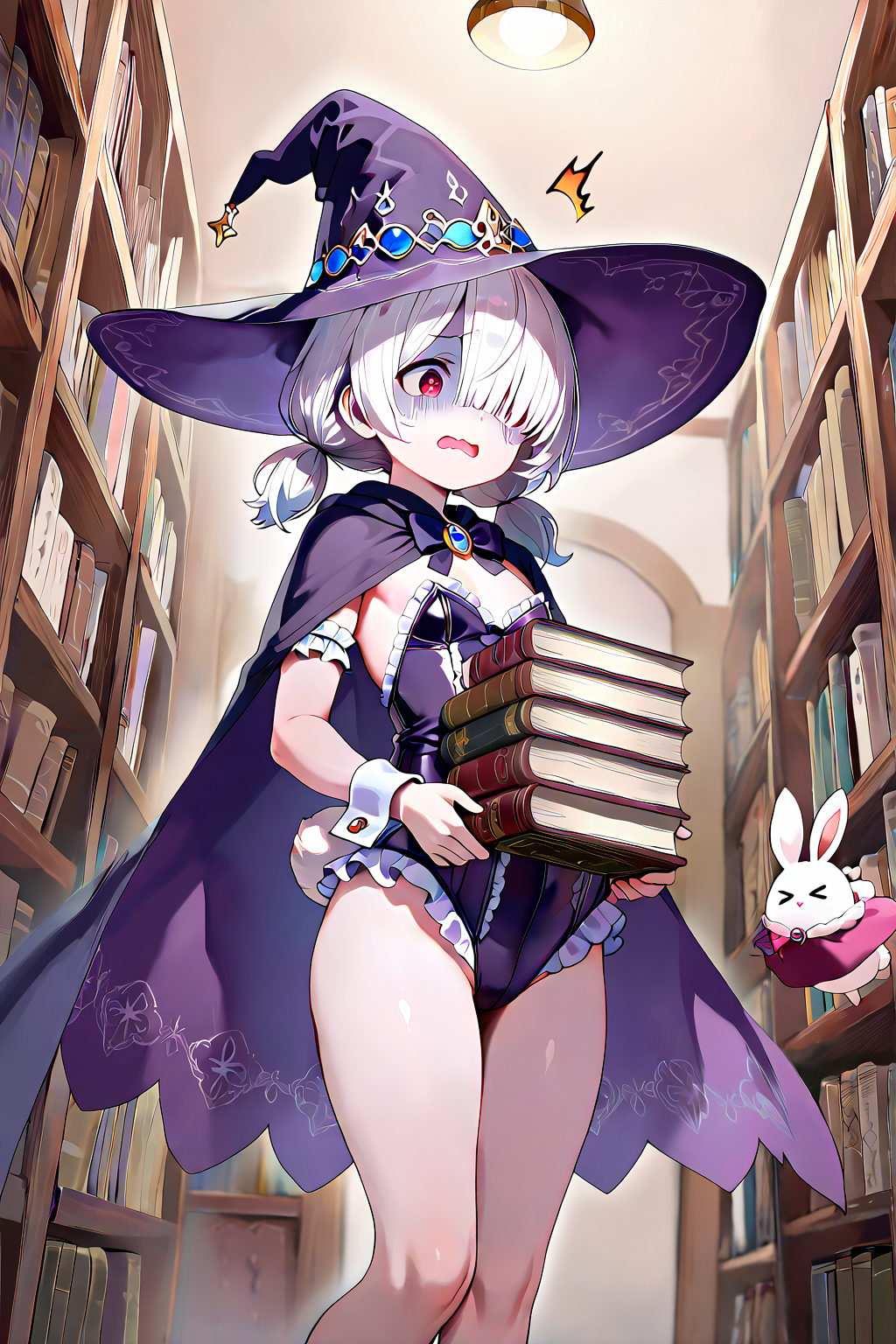 , The Apprentice Little Witch girl carrying a lot of books and almost tripping and falling,,, The stacks of the Royal Library without windows,