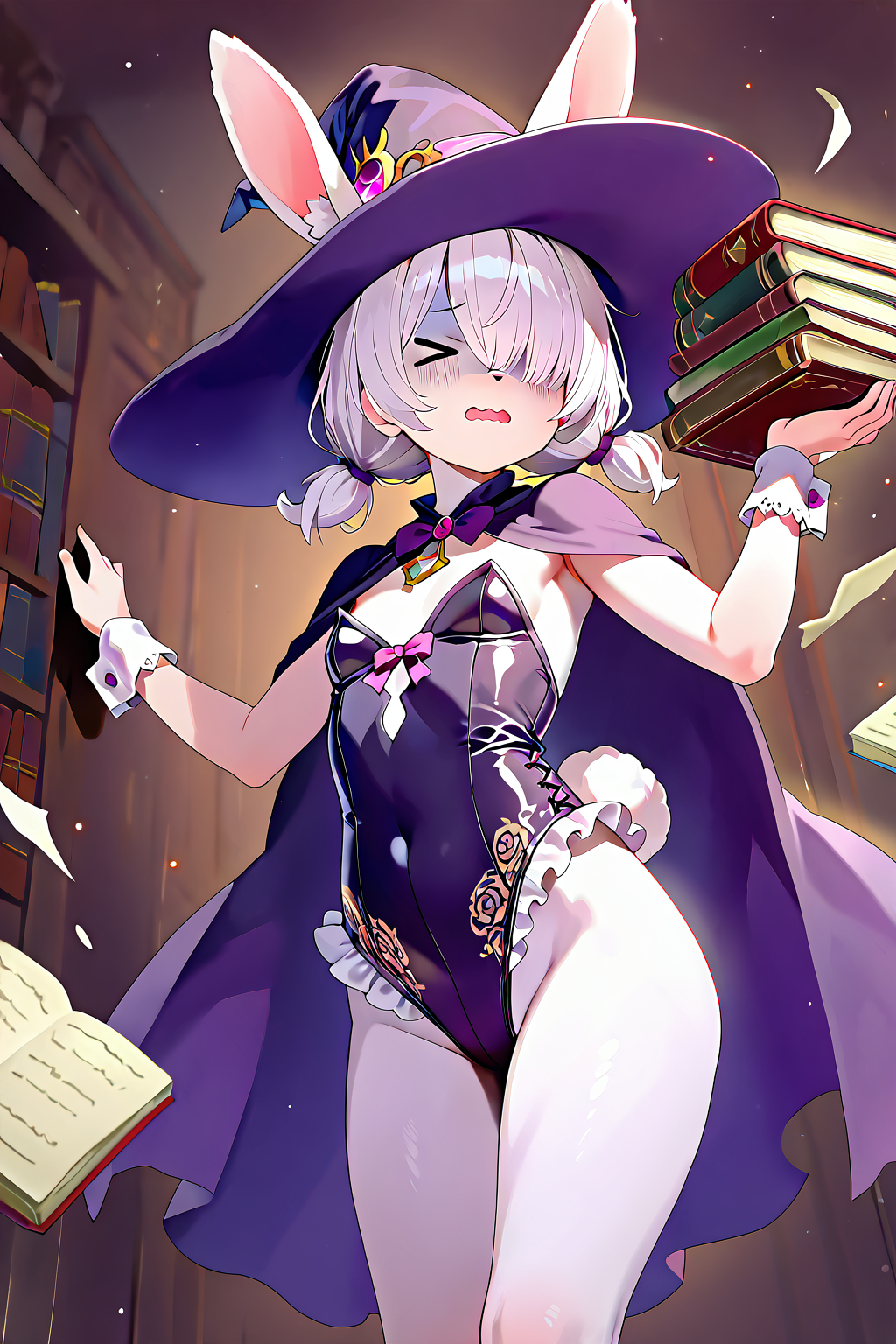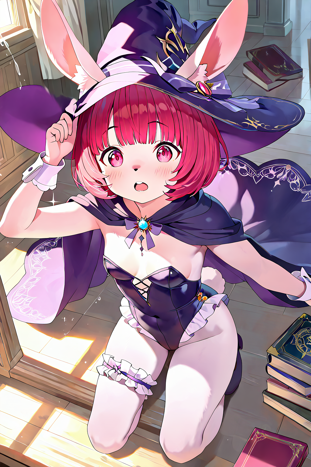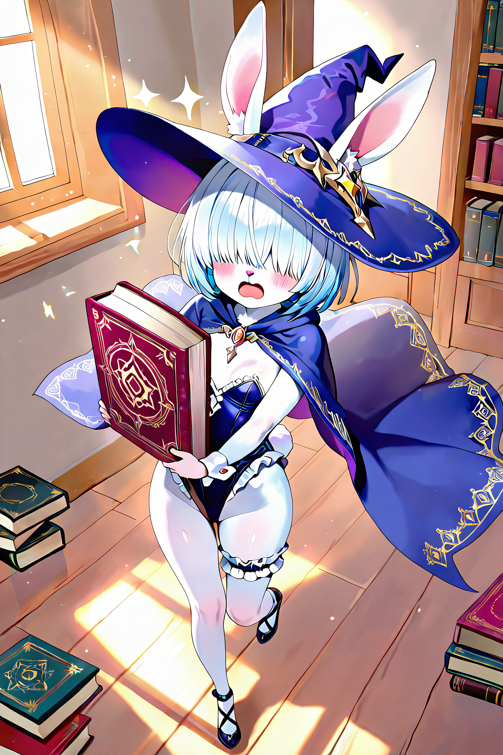 , 1 little witch ( anthromorphic rabbit ) child girl , short stature, moe detailed face, rabbit ears, rabbit tail, rabbit nose, furry skin, , ultra super fine gorgeous detailed Frilled leotard with wizard cloak, , wrist cuffs, ,