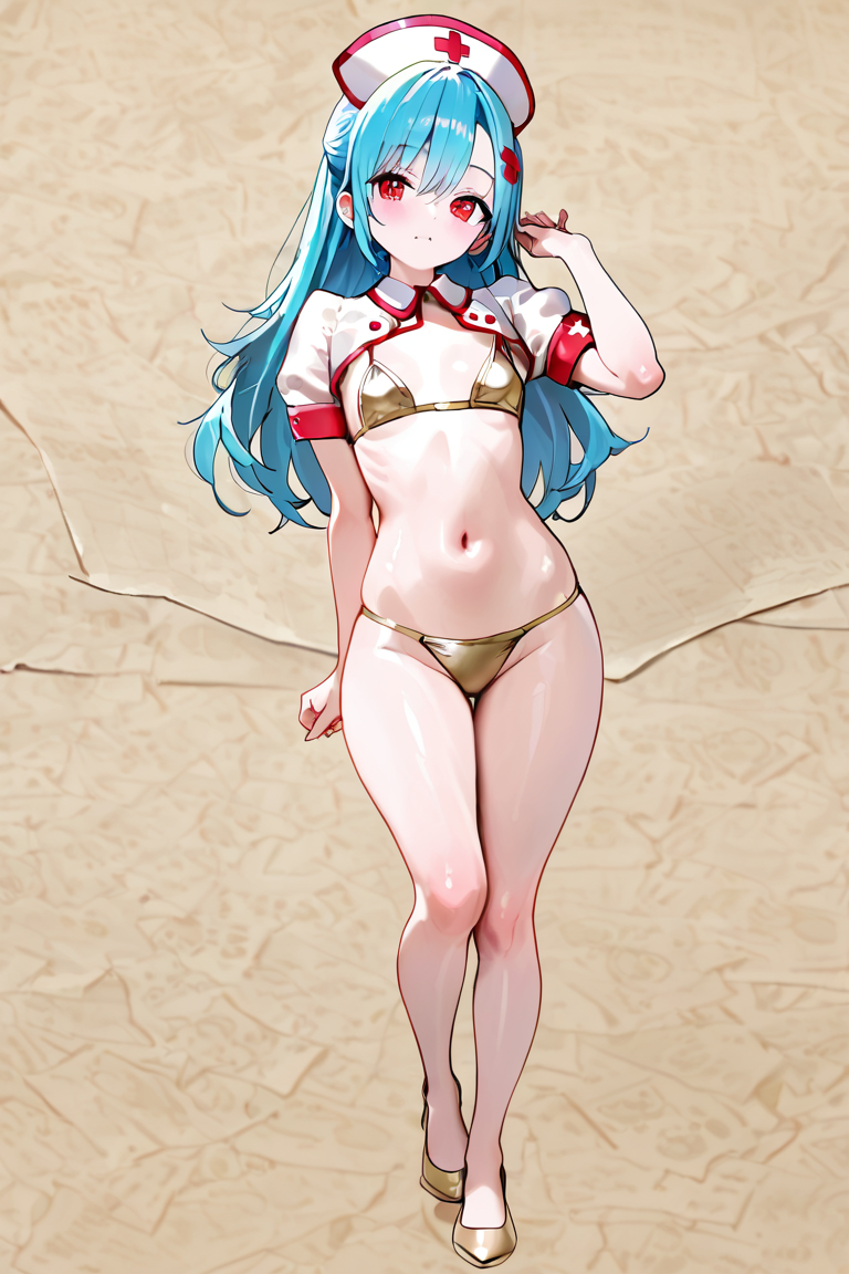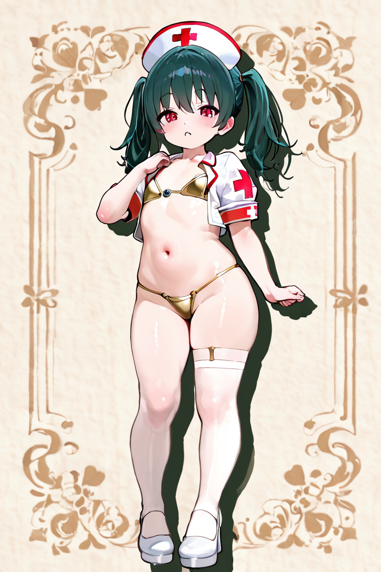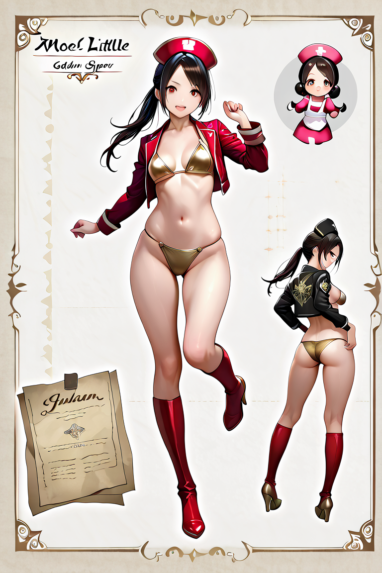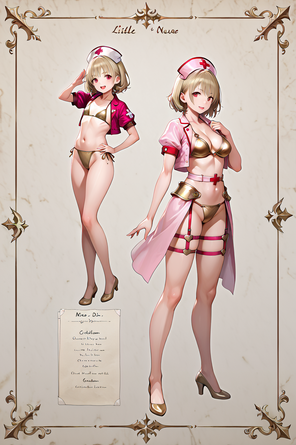 , 1 nurse little girl, moe detailed face, semi‑realistic ultra super fine detailed gorgeous golden nurse bikini armor, nurse bolero jacket ,