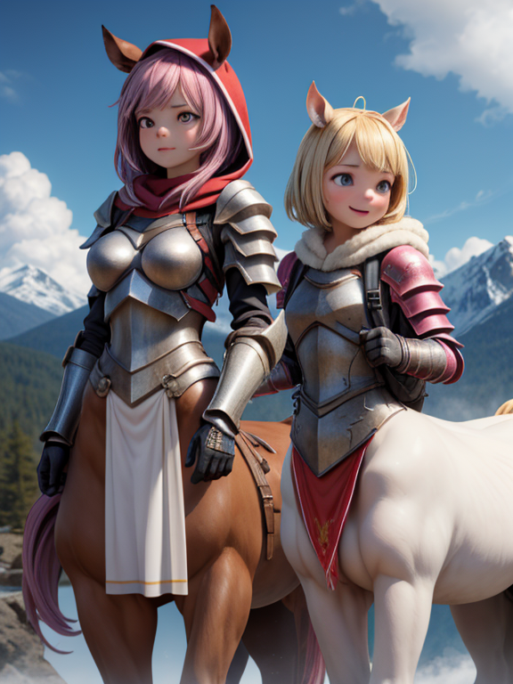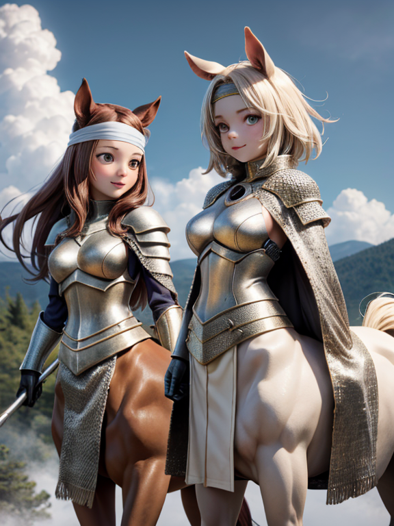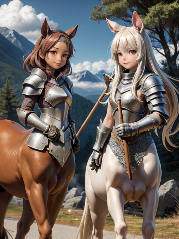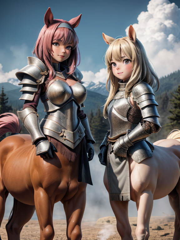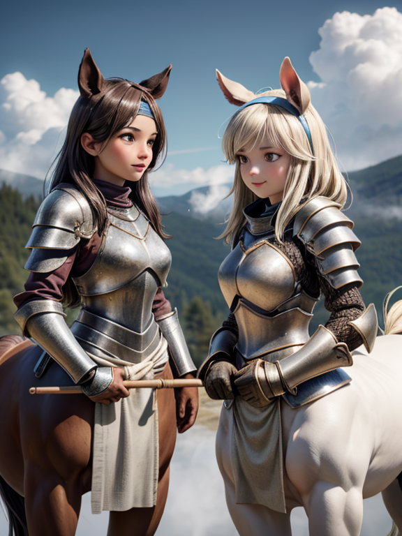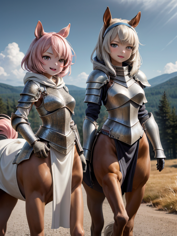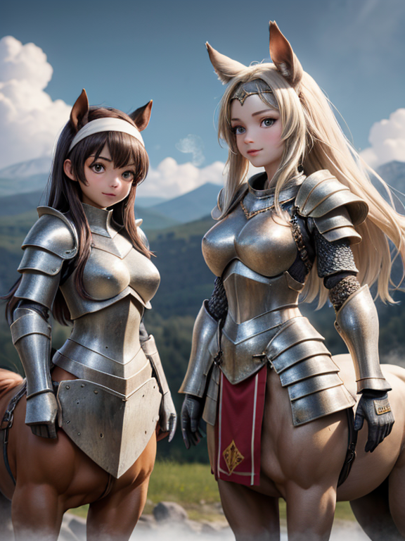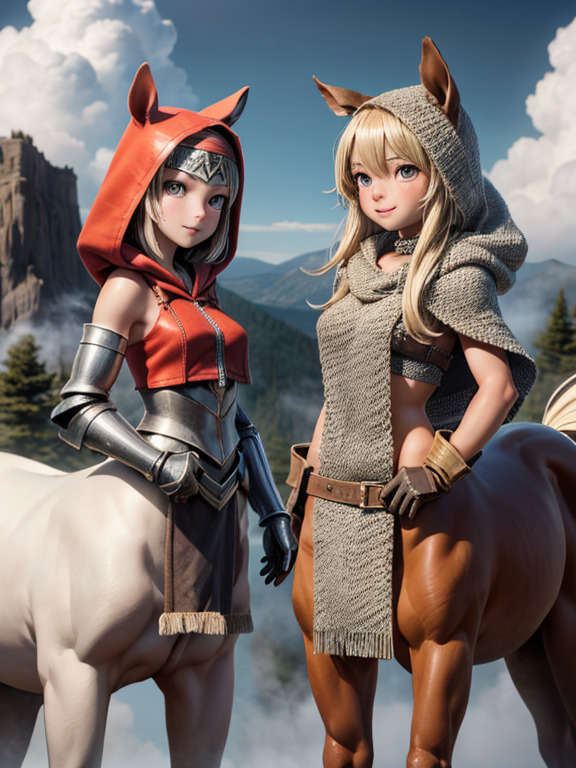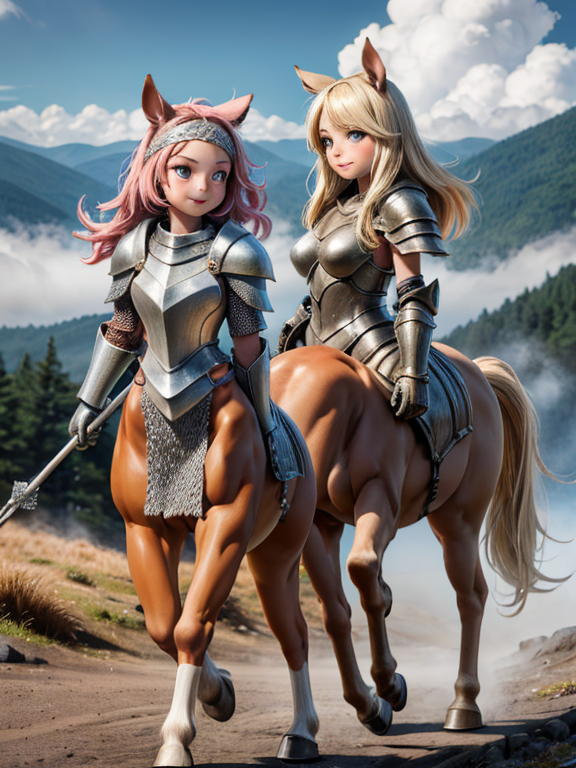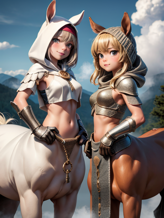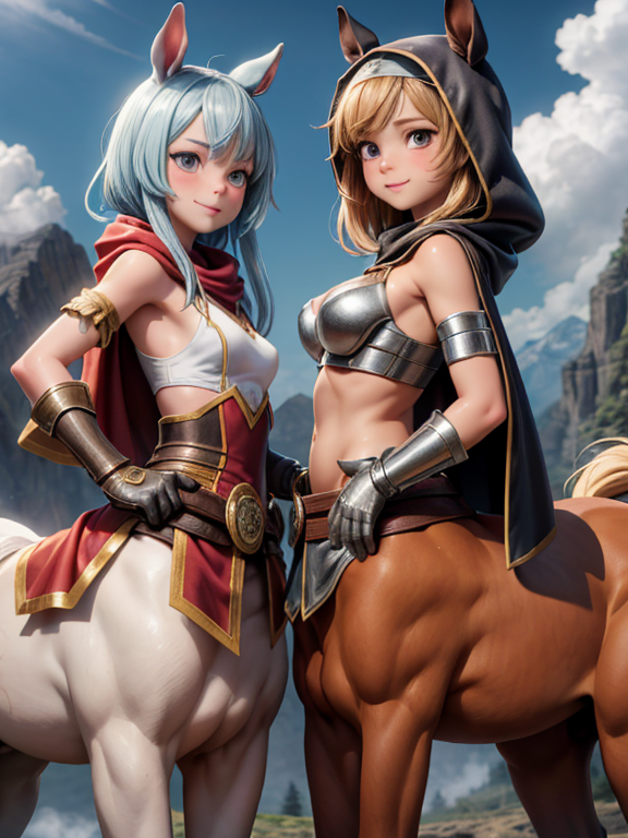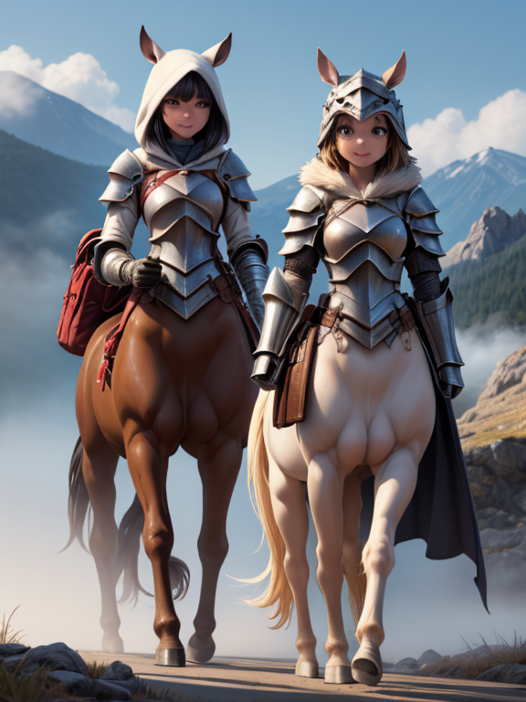 (2 girls Warrior Centaurs ), ( horse ear, no ear ), armor with hood cloak , ( loincloth:1.4,), gauntlets, headband, metal gloves, backpacks , Centaurs walking side by side, face happy, face viewer,