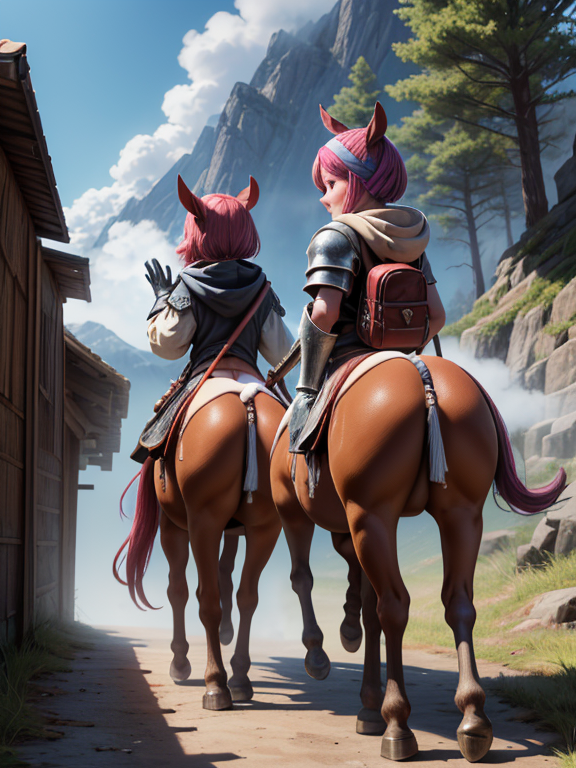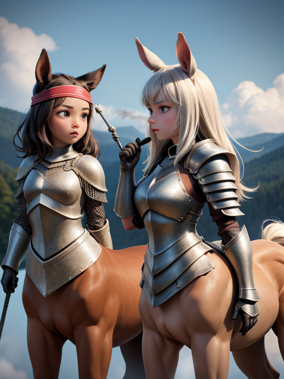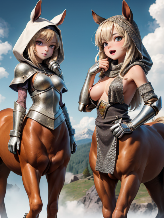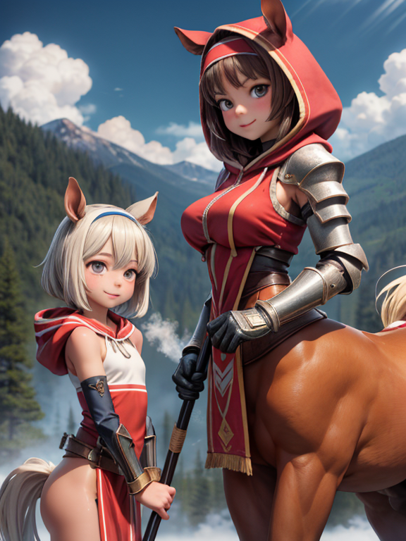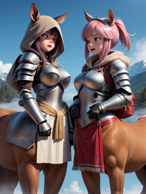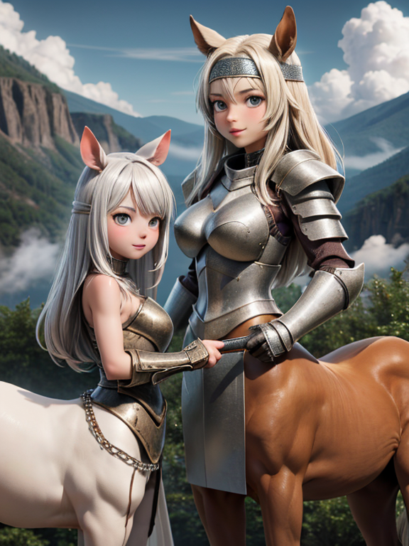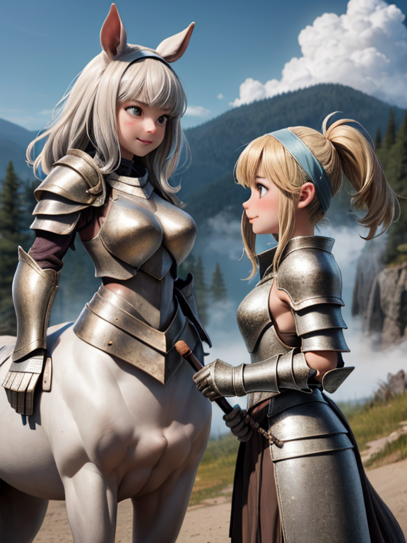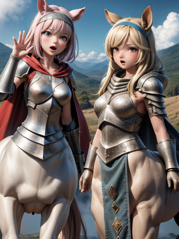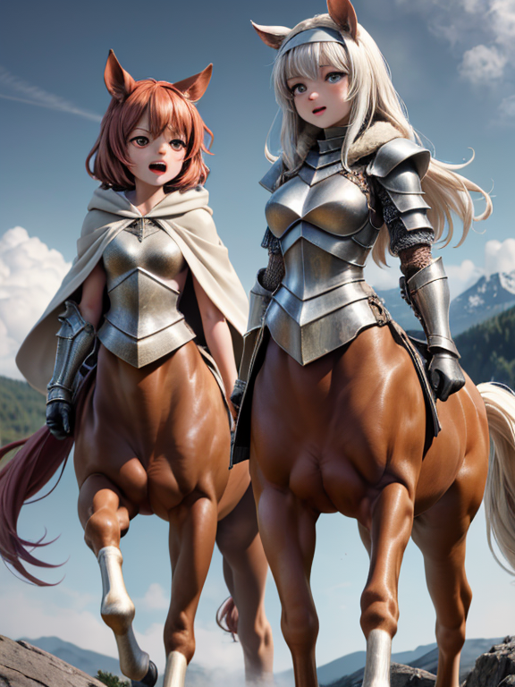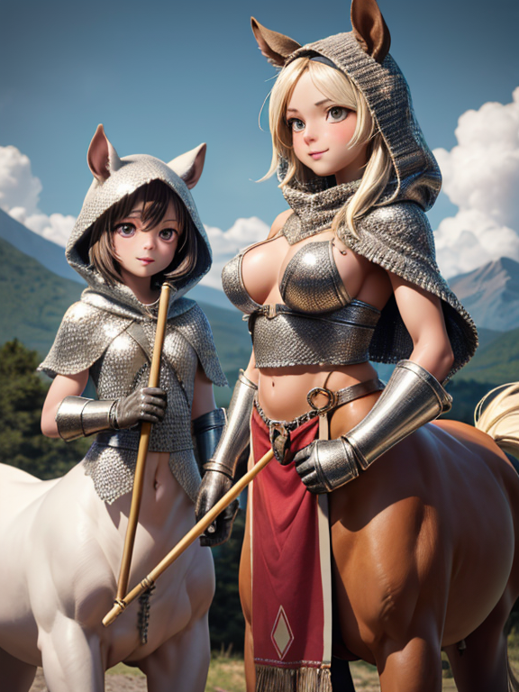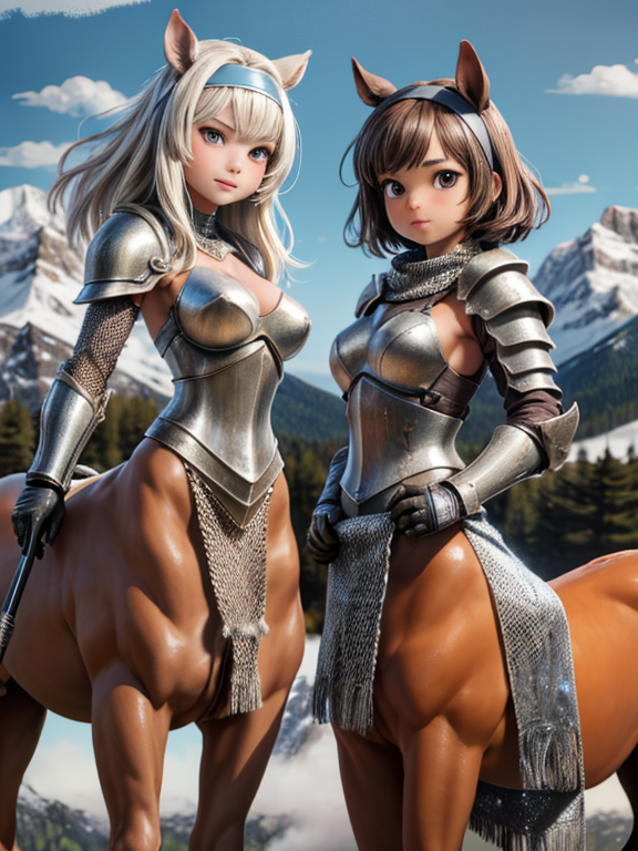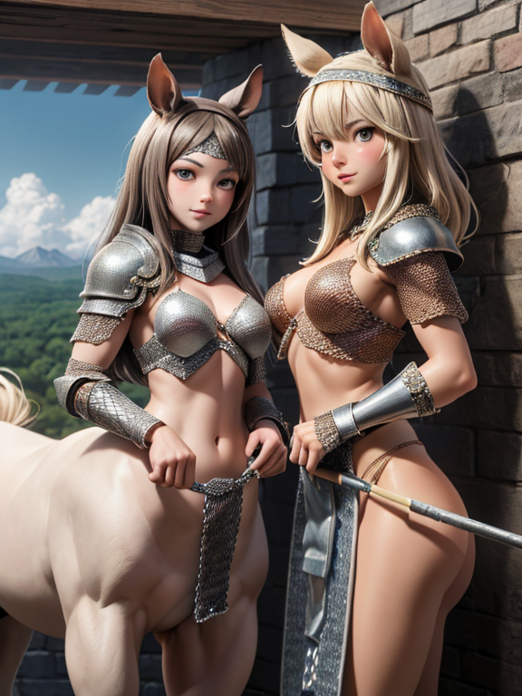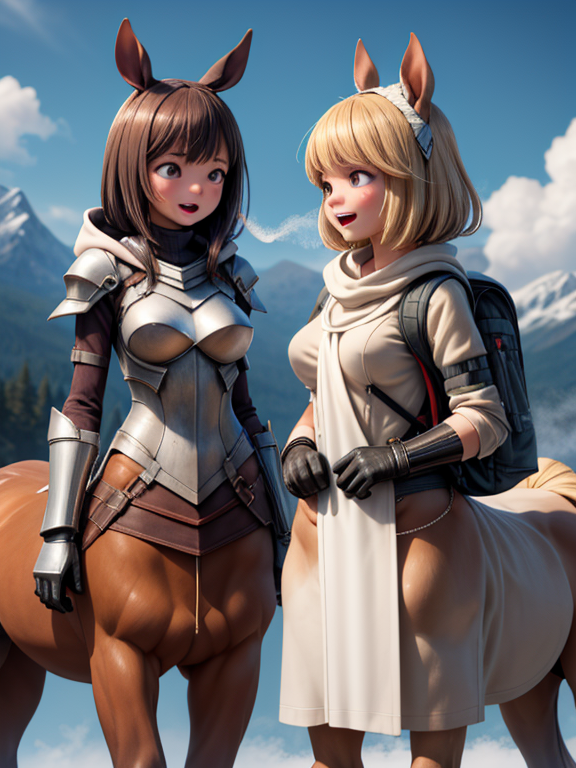 (2 girls Warrior Centaurs ), ( horse ear, no ear ), armor with hood cloak , ( loincloth:1.4,), gauntlets, headband, metal gloves, backpacks , Centaurs walking side by side, face happy, face viewer,