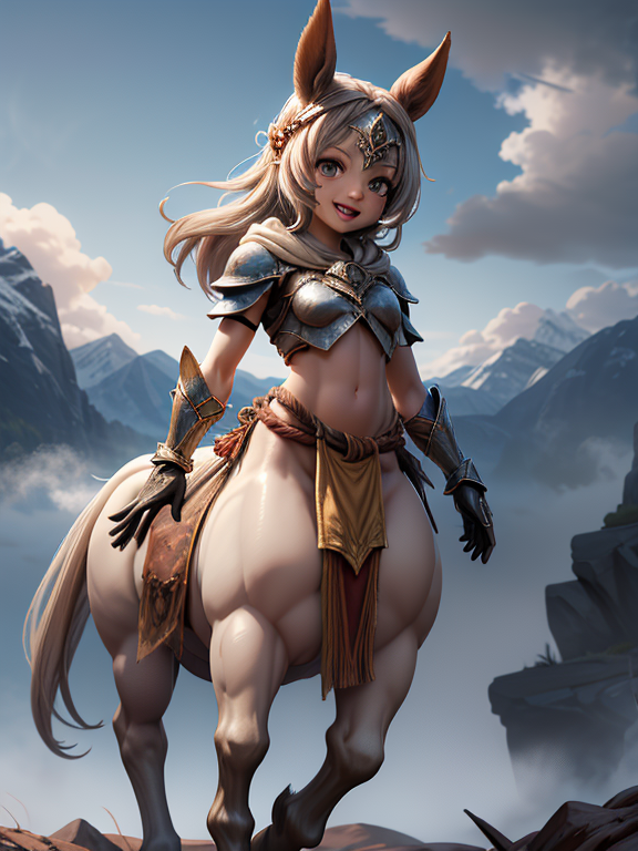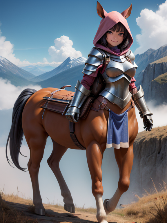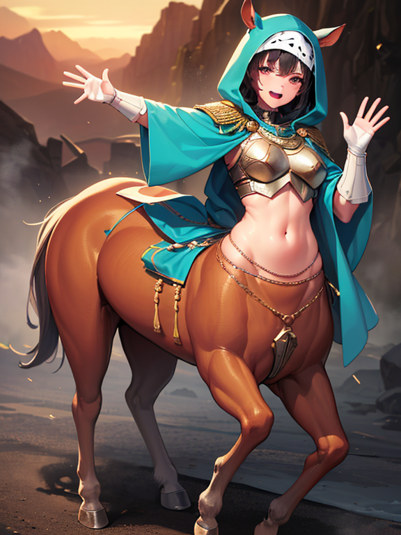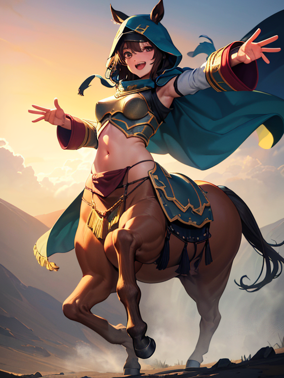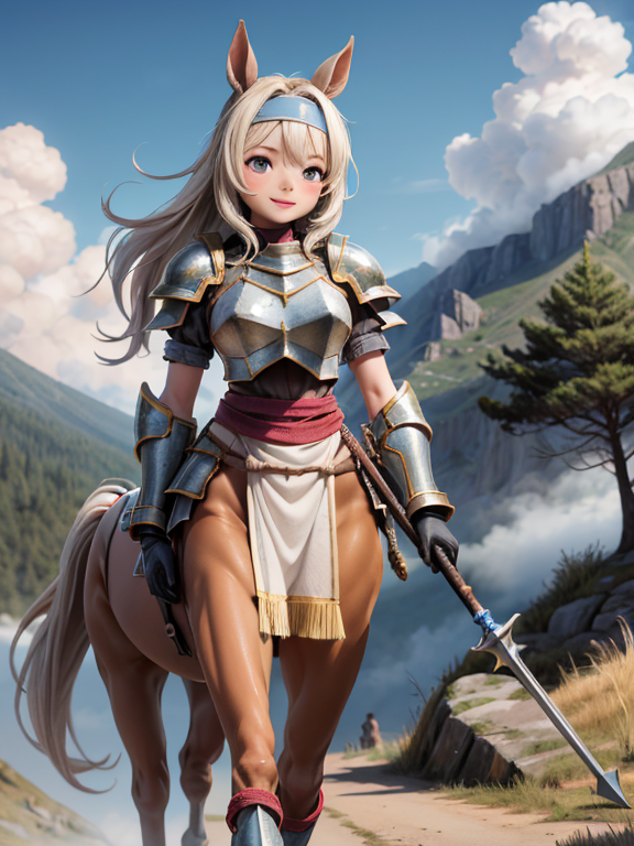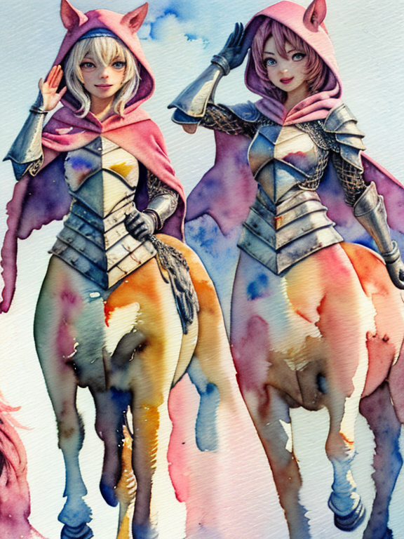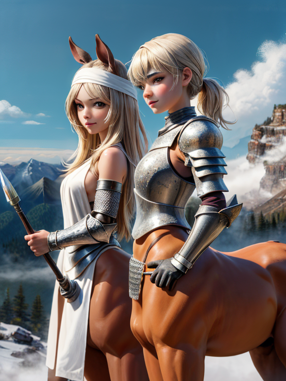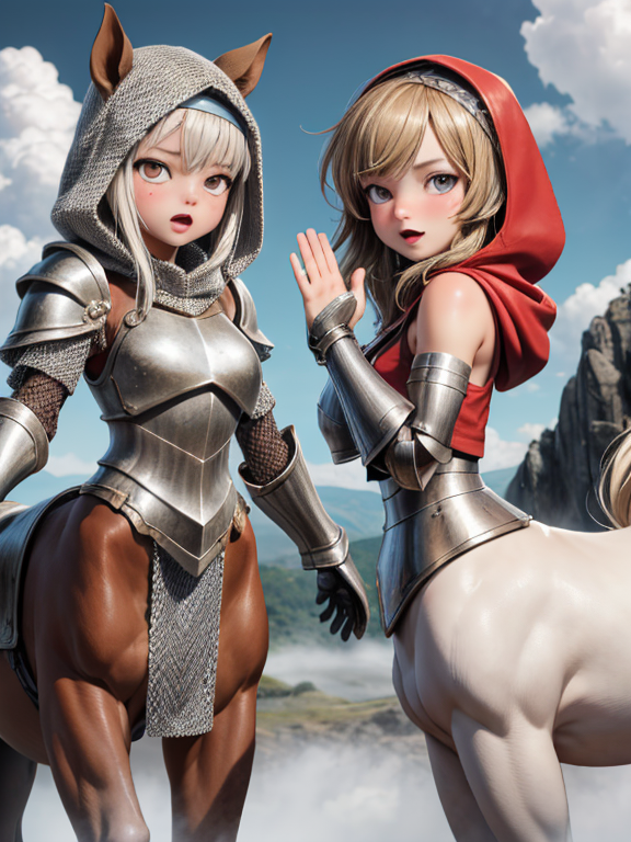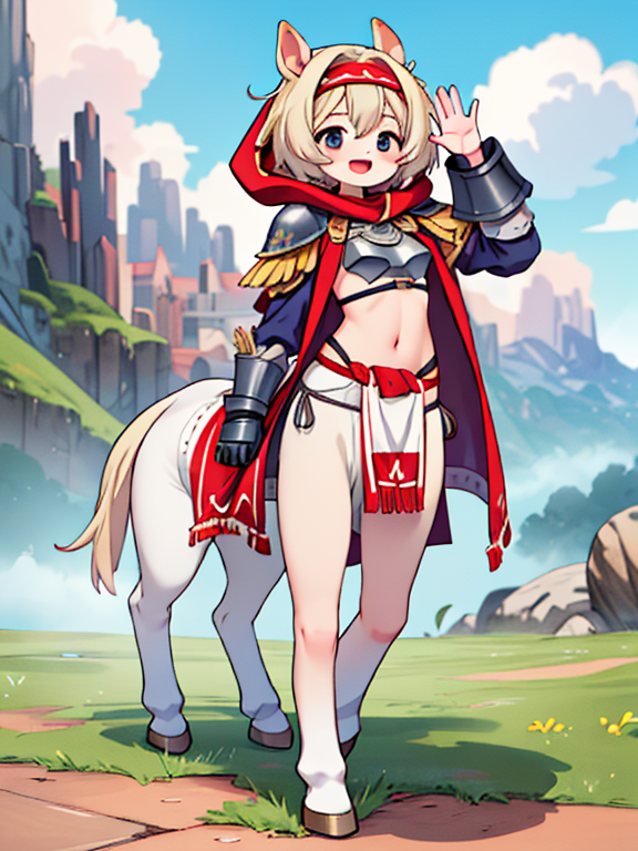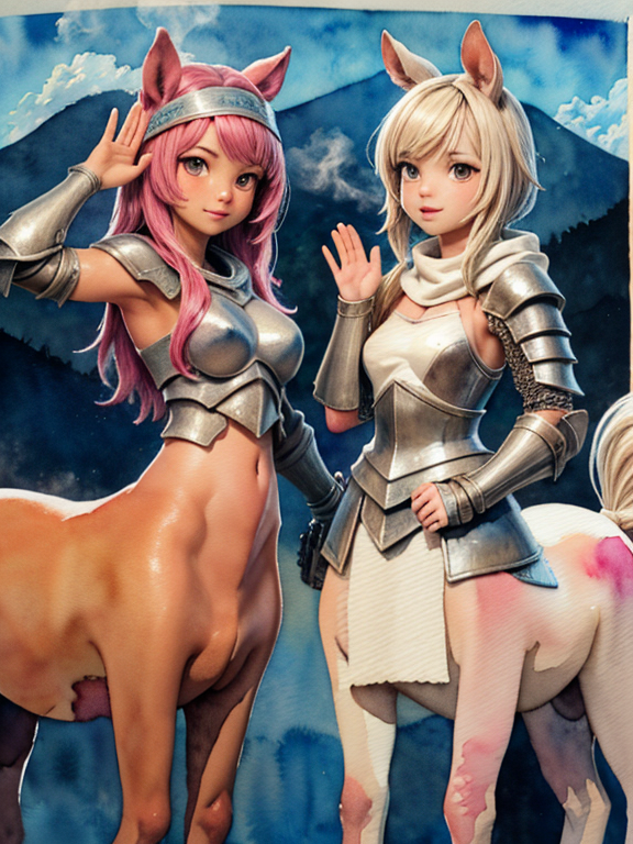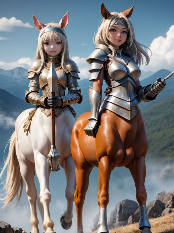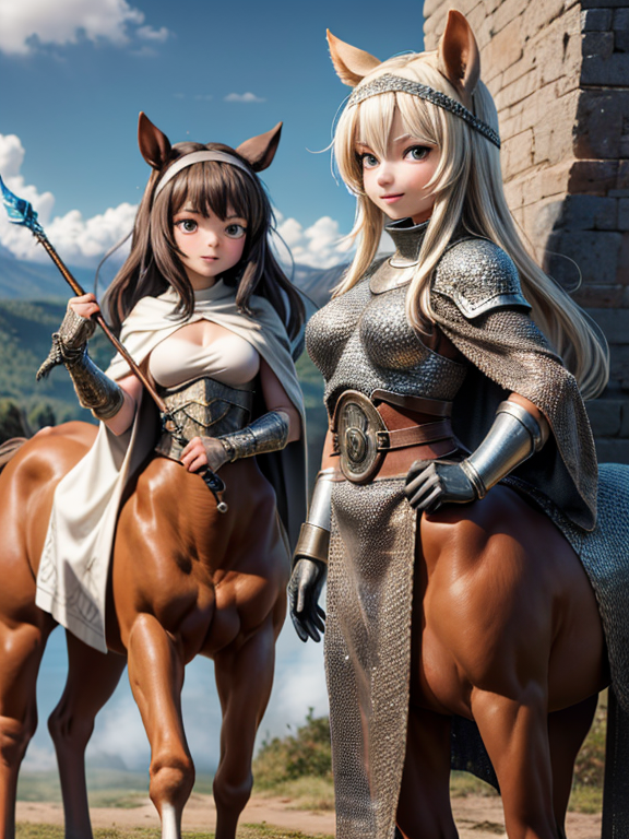 (2 girls Warrior Centaurs ), ( horse ear, no ear ), armor with hood cloak , ( loincloth:1.4,), gauntlets, headband, metal gloves, backpacks , Centaurs walking side by side, face happy, face viewer,