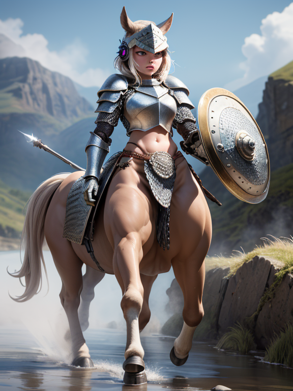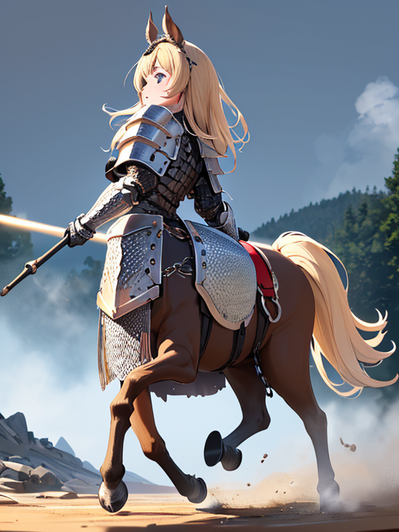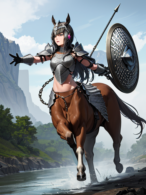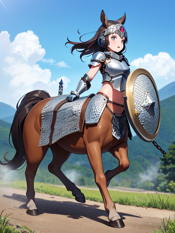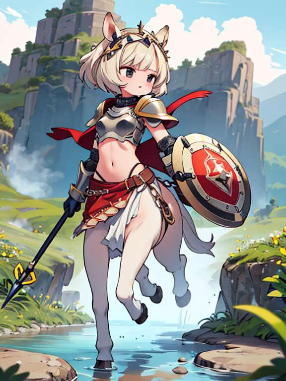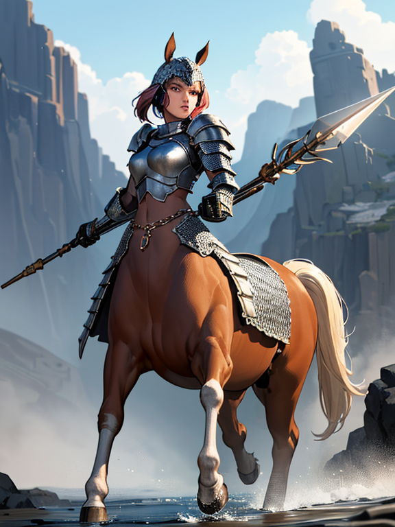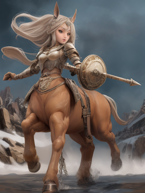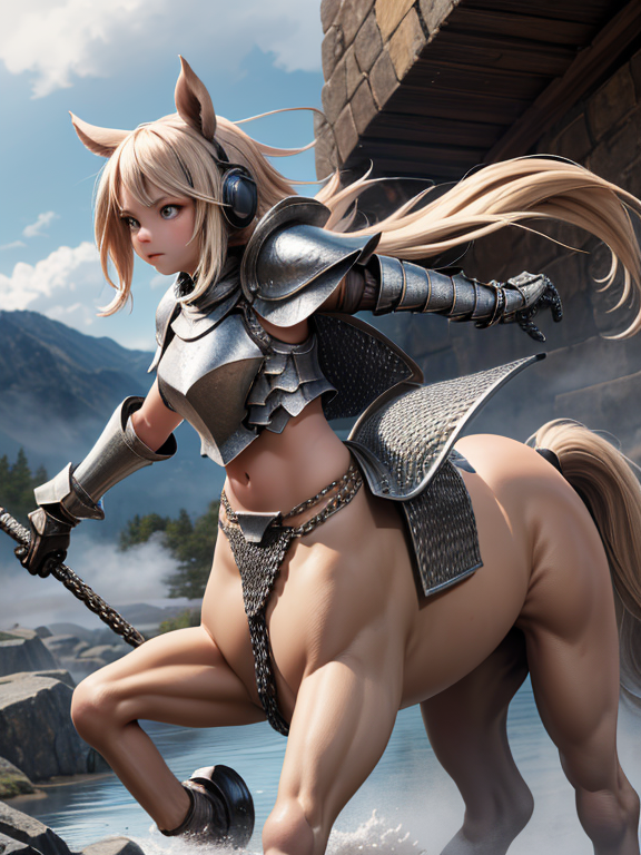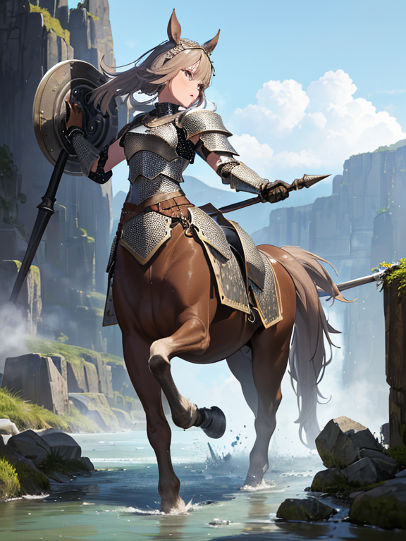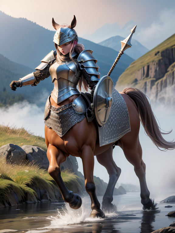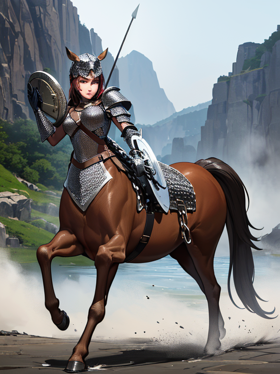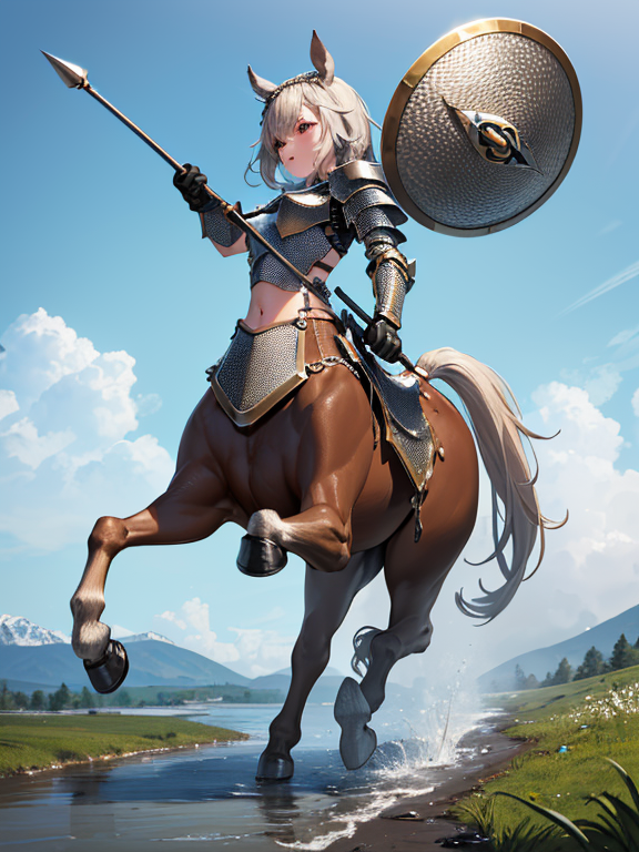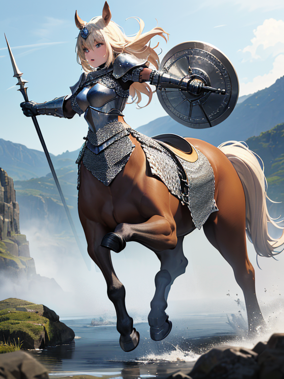 (1 female centaurcpt centaur ), ( horse ear, no ears, hair over ears, ), ( 4 horse-legs ) , ( chainmail loincloth:1.2 ) , metal gloves , valkyrie armor, headpiece, ( hand holding long-spear , hand holding small shield , ), running , face away, from front to side, full body, fighting pose, dynamic pose,