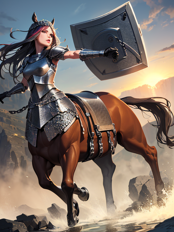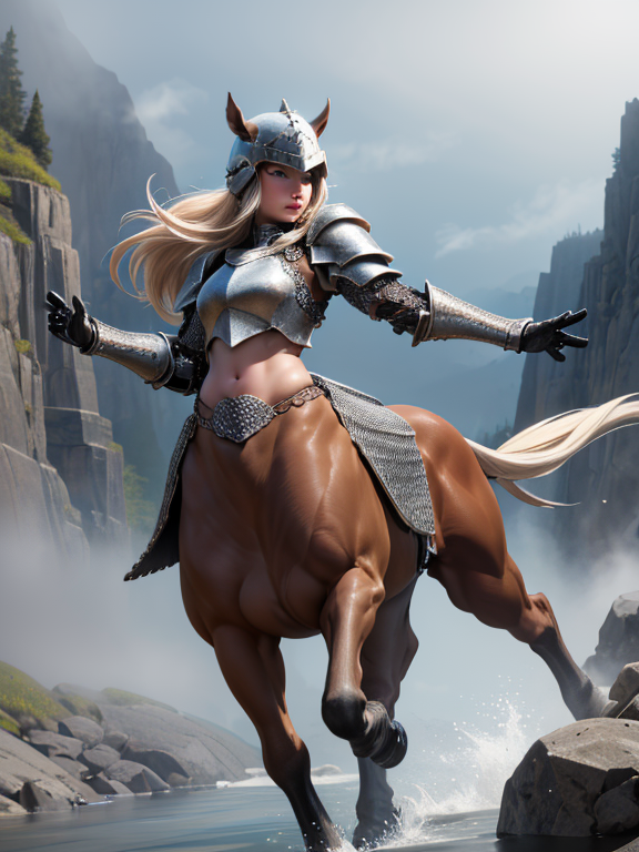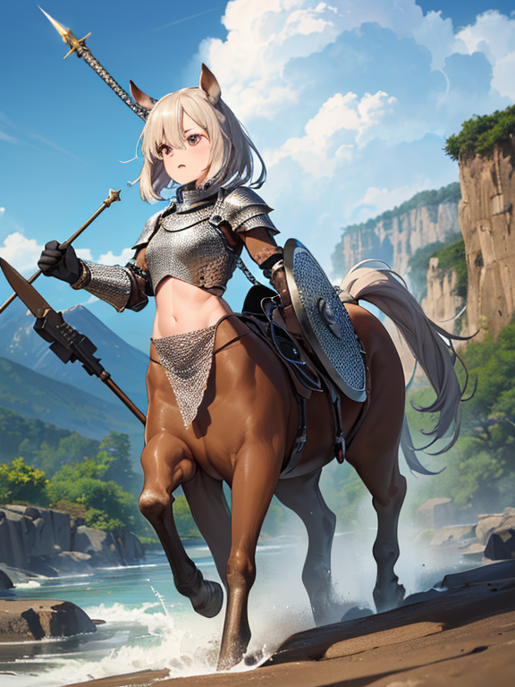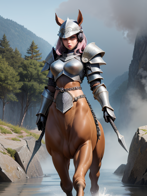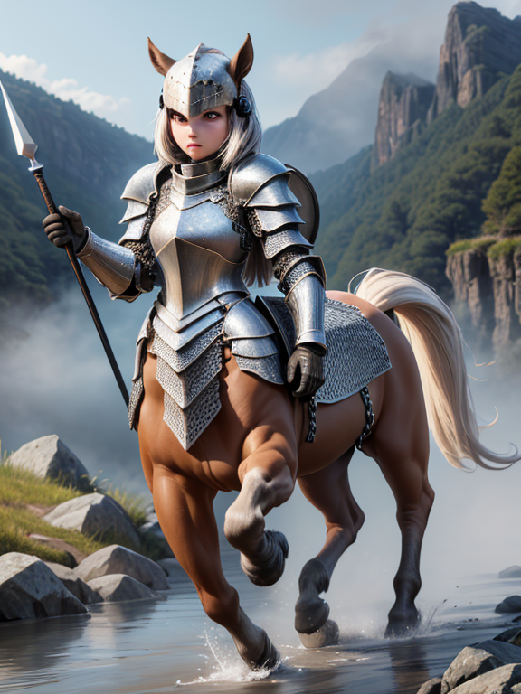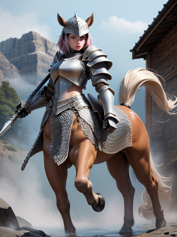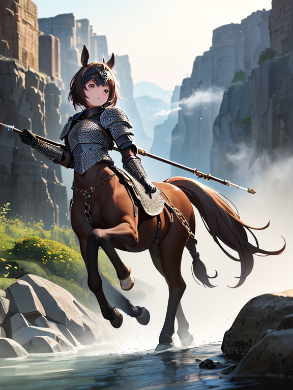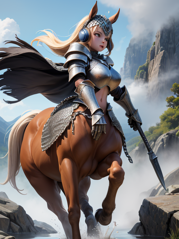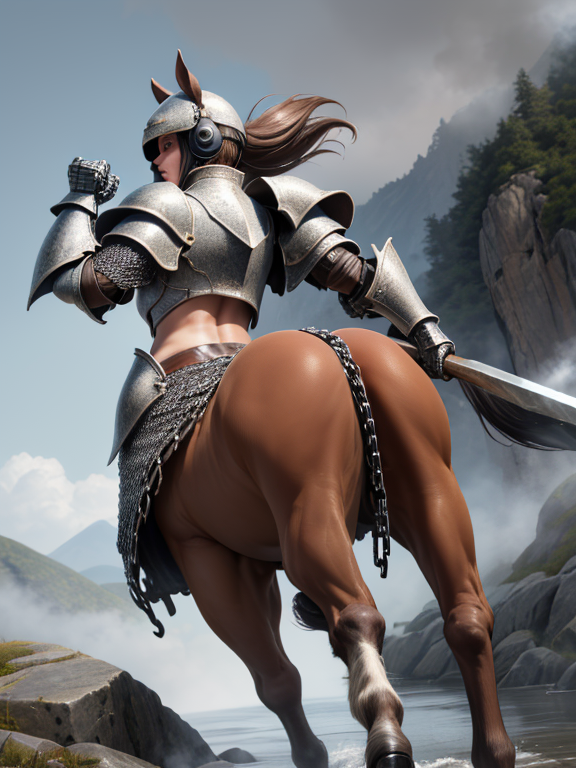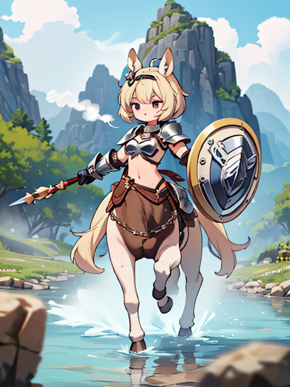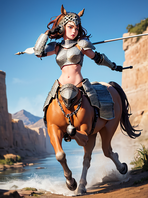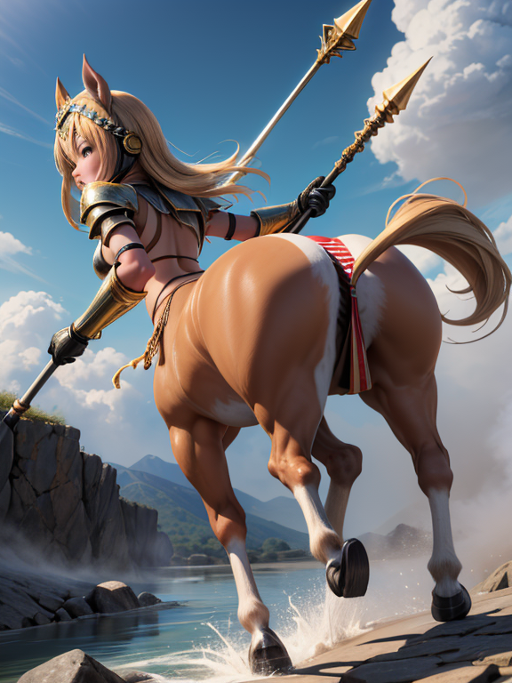 (1 female centaurcpt centaur ), ( horse ear, no ears, hair over ears, ), ( 4 horse-legs ) , ( chainmail loincloth:1.2 ) , metal gloves , valkyrie armor, headpiece, ( hand holding long-spear , hand holding small shield , ), running , face away, from front to side, full body, fighting pose, dynamic pose,