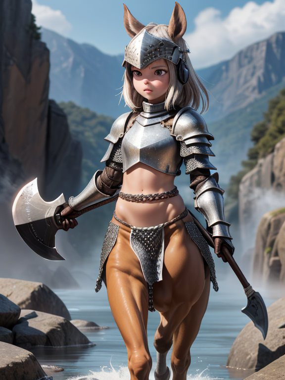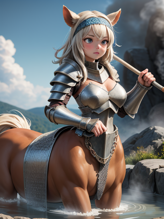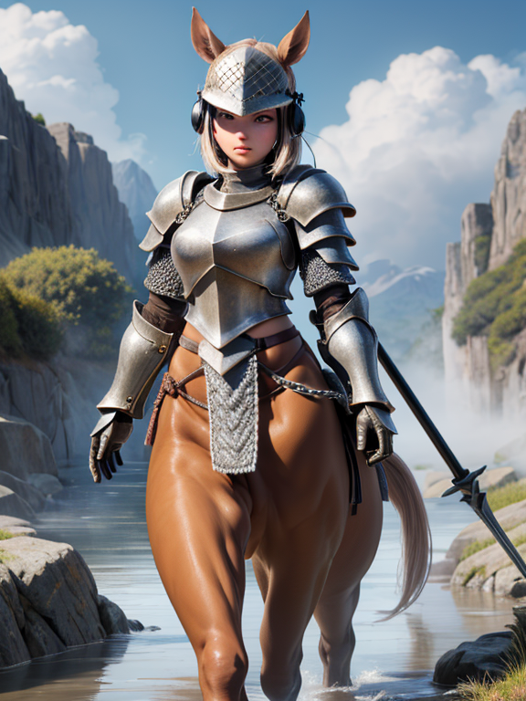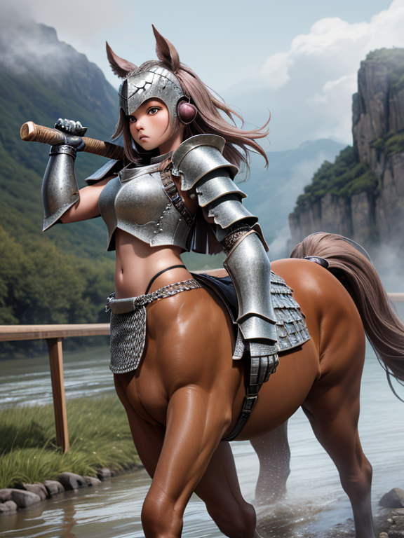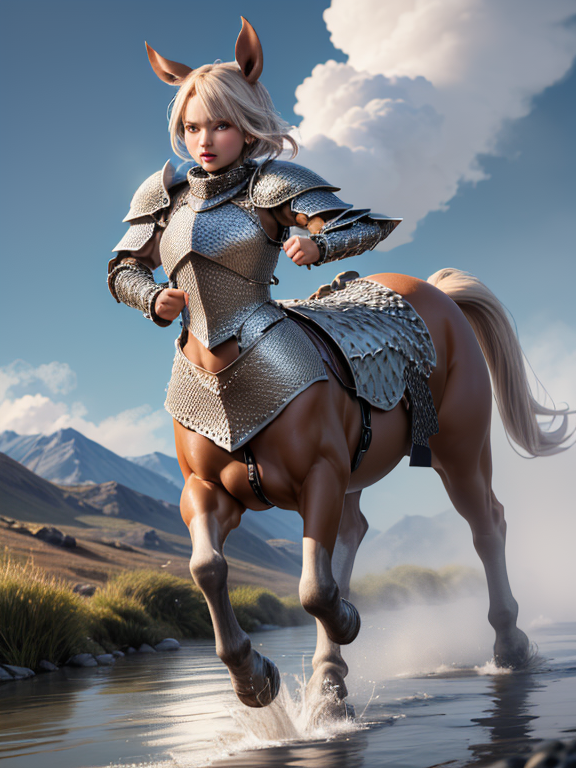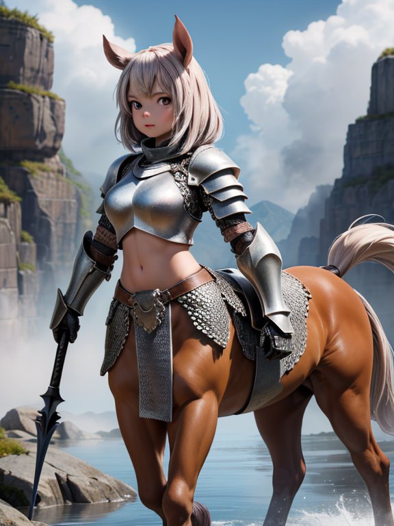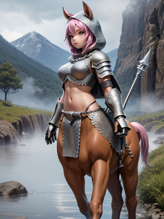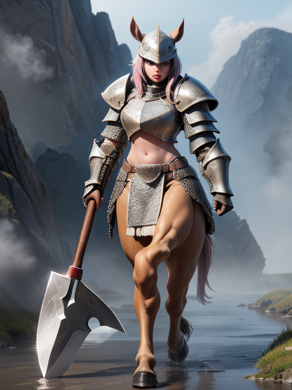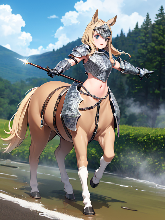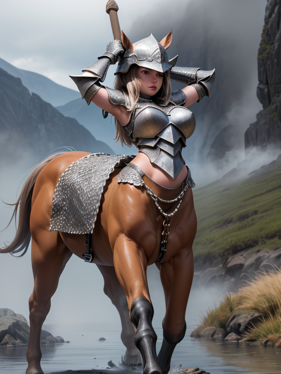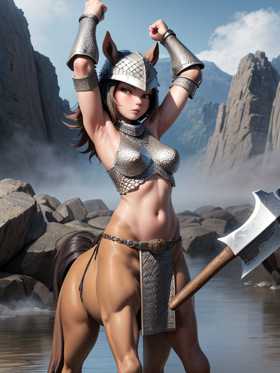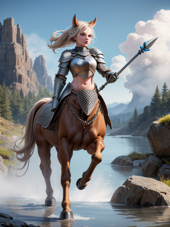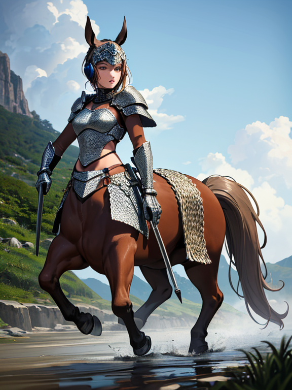 (1 female centaurcpt centaur ), ( horse ear, no ears, hair over ears, ), ( 4 horse-legs ) , ( chainmail loincloth:1.2 ) , metal gloves , valkyrie armor, headpiece, ( hand holding long-spear , hand holding small shield , ), running , face away, from front to side, full body, fighting pose, dynamic pose,