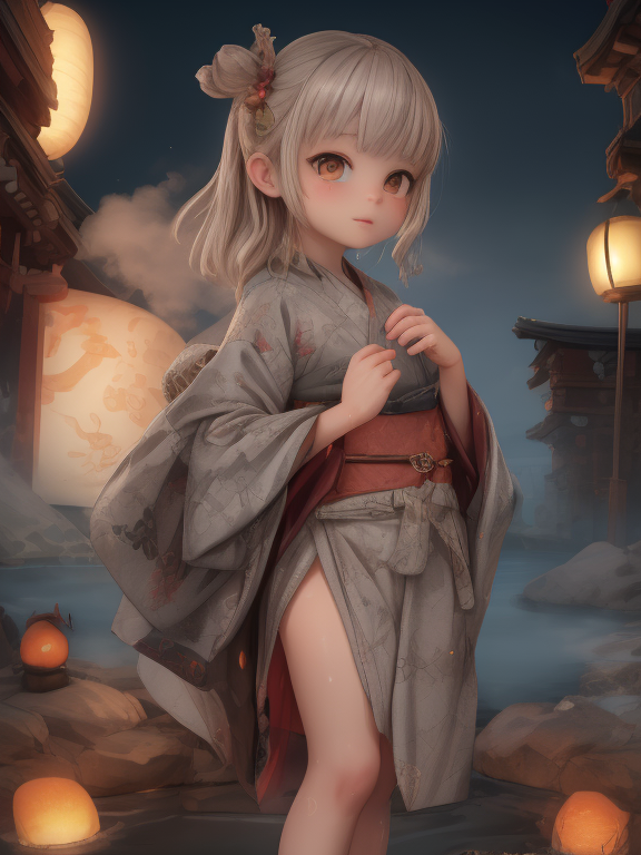 a girl is standing in front of numerous detailed (japanese_lamps:1.5) in the dark Mountain Hot Spring in pool, wet,