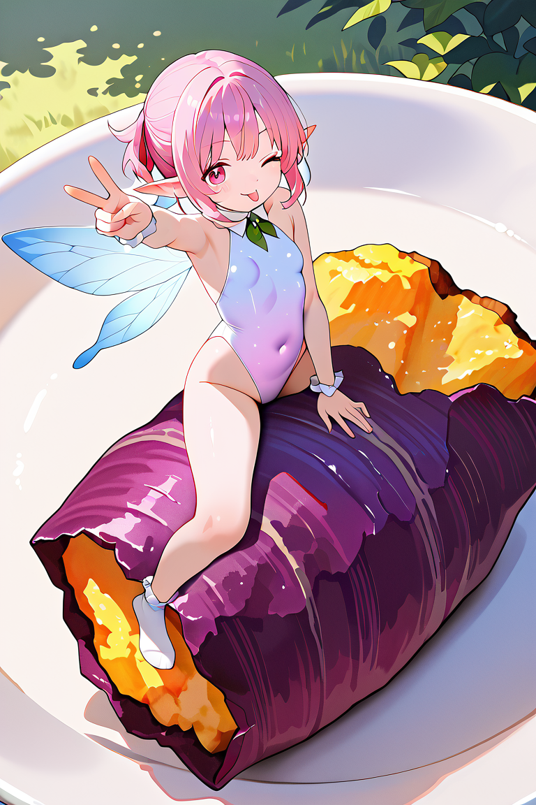 , 1 tiny fairy girl, moe detailed face, ultra super fine gorgeous detailed leotard, Transparent fairy wings , elf ears , ;p , hold giant roasted sweet potato,, outdoor, on white Table,
