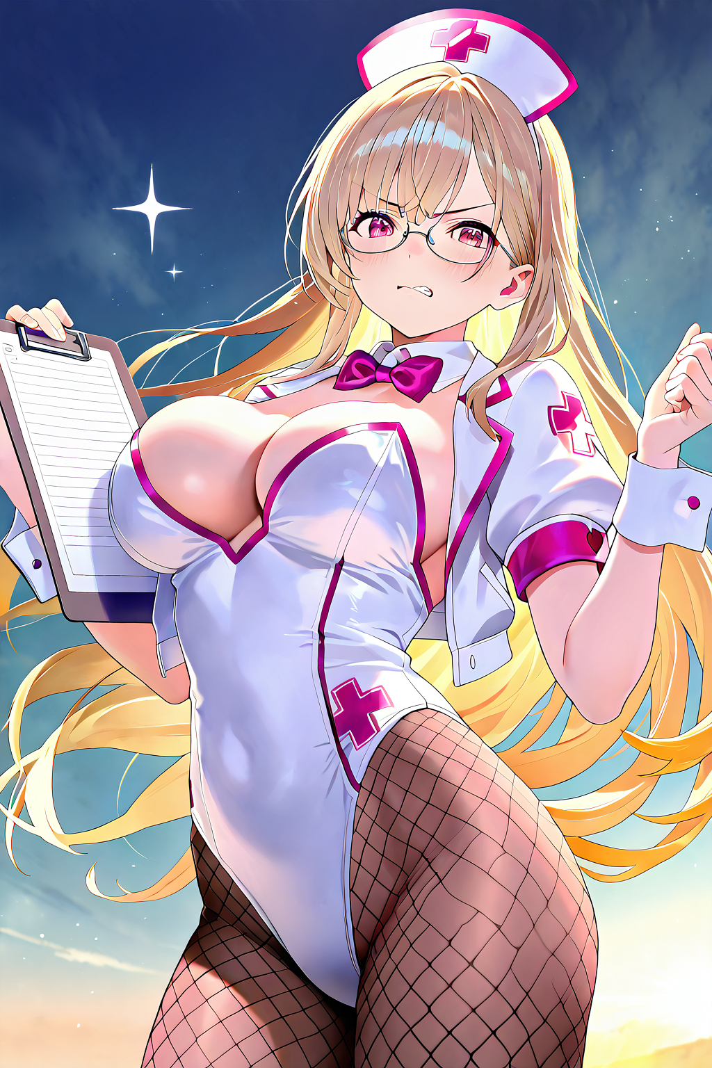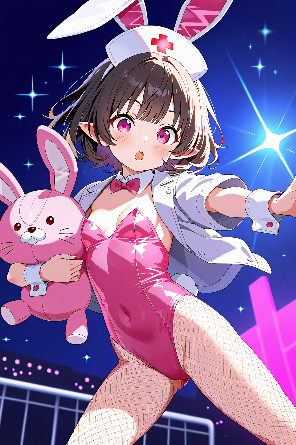 , 1 nurse girl , moe detailed face, ultra super fine gorgeous detailed White leotard, fishnet pantyhose, bunny hair band, detached collar,, bow, wrist cuffs, bowtie,